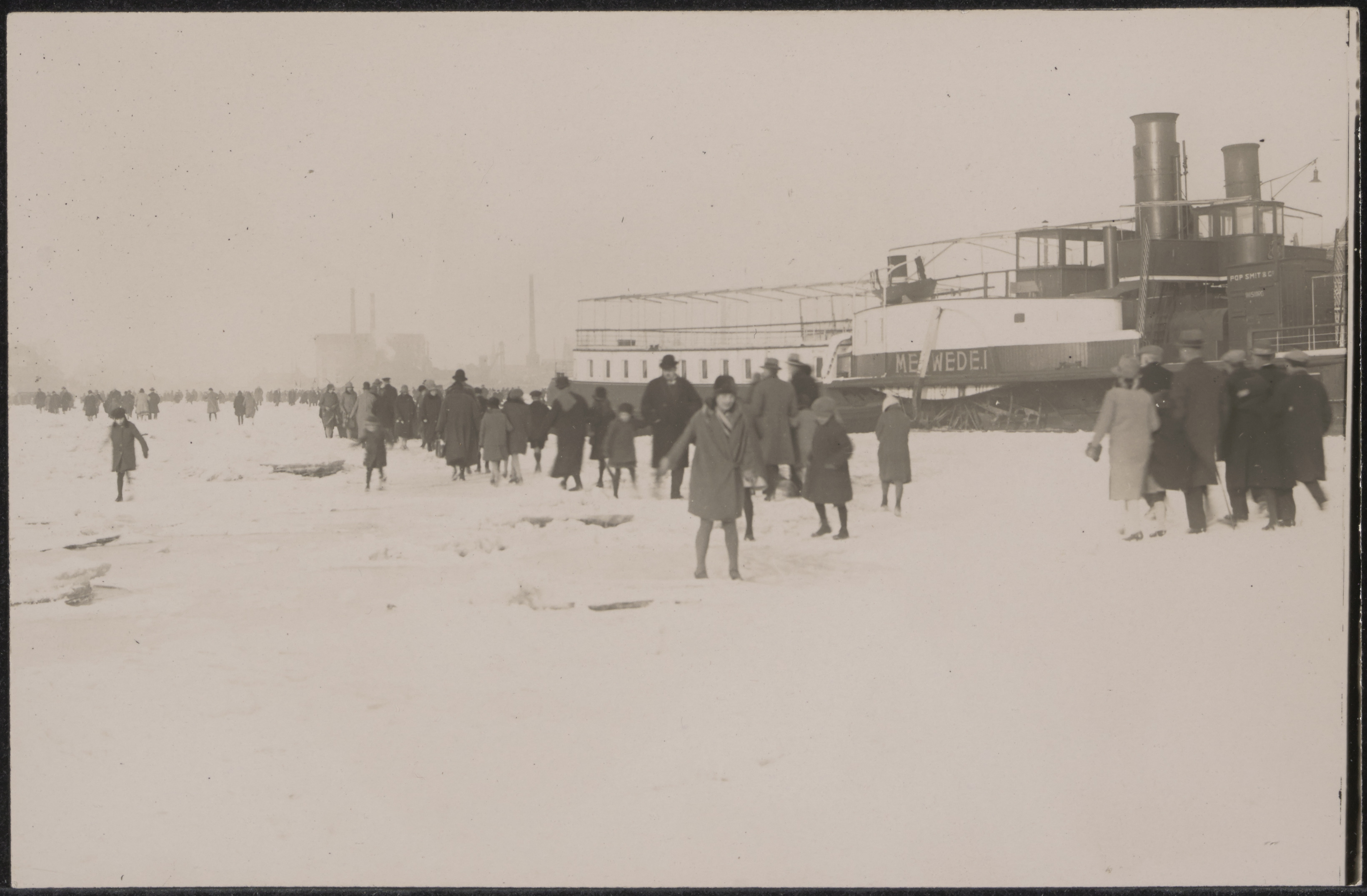 - Stoomraderboot Merwede I van rederij Fop Smit vast in het ijs op de Nieuwe Maas. Reizigers gaan te voet tussen Kralingseveer en IJsselmonde.