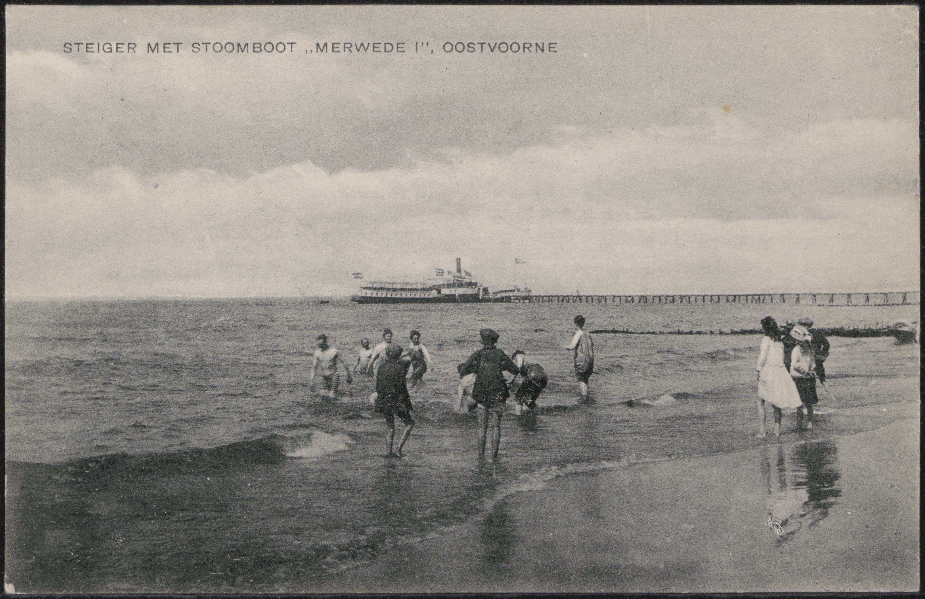 - Aanlegsteiger met veerboot Merwede I van rederij Fop Smit bij het strand van Oostvoorne.