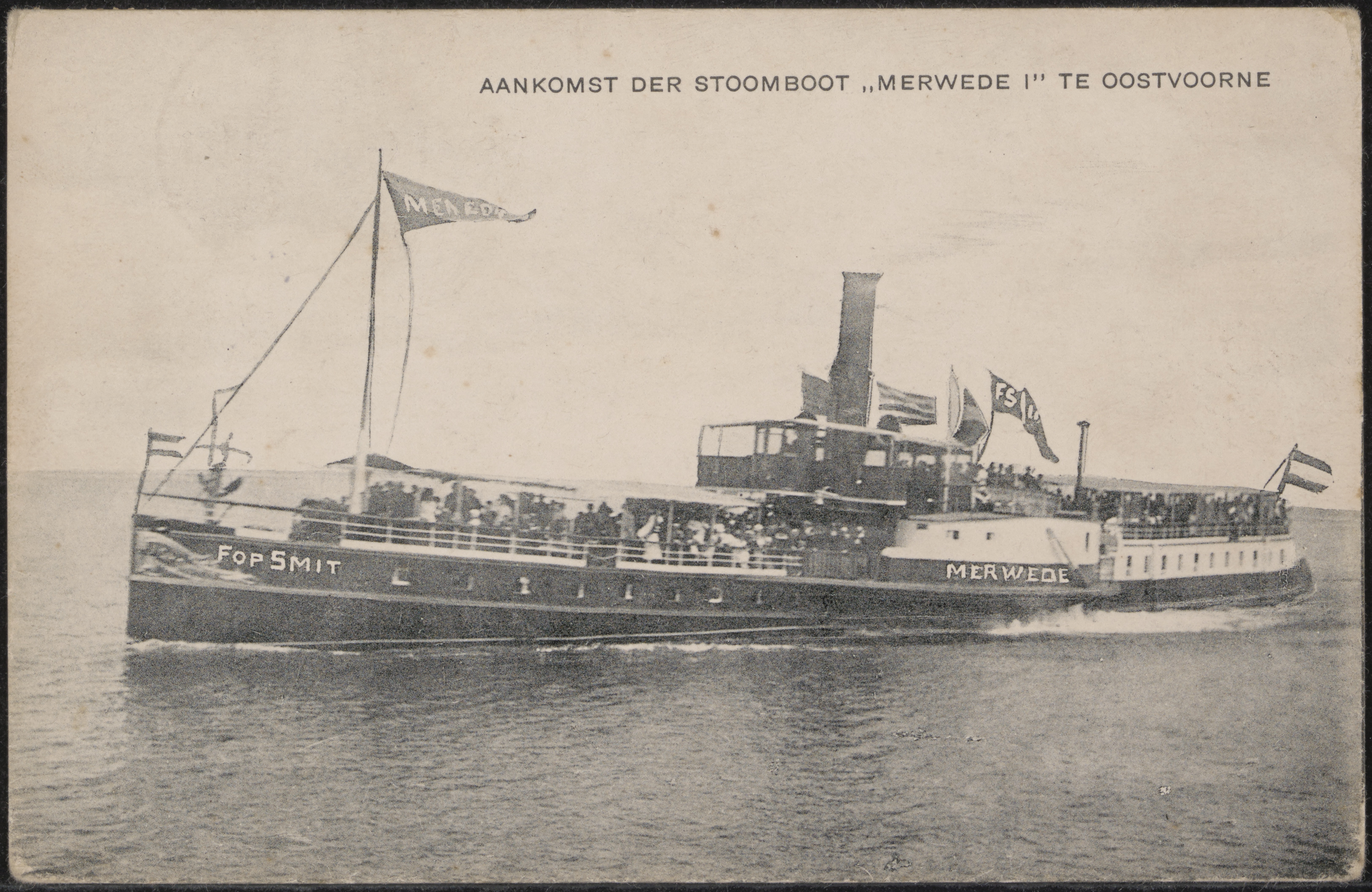 Aankomst stoomraderboot "Merwede I "van rederij Fop-Smit hier bij Oostvoorne.