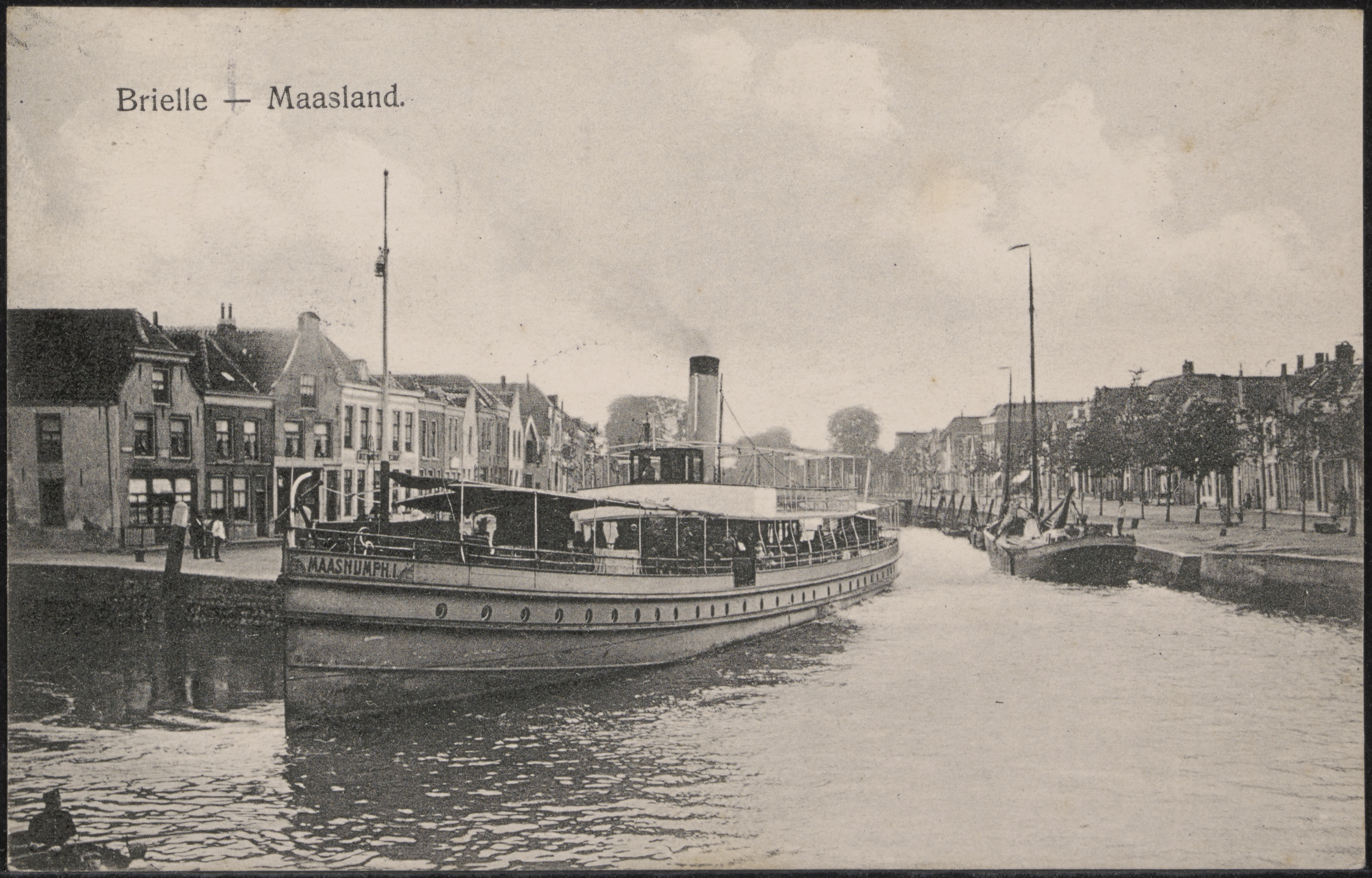 - Stoomschip Maasnymph I in Brielle in de monding van de Noord Spui met links Maarland Zuidzijde en rechts de Noordzijde.