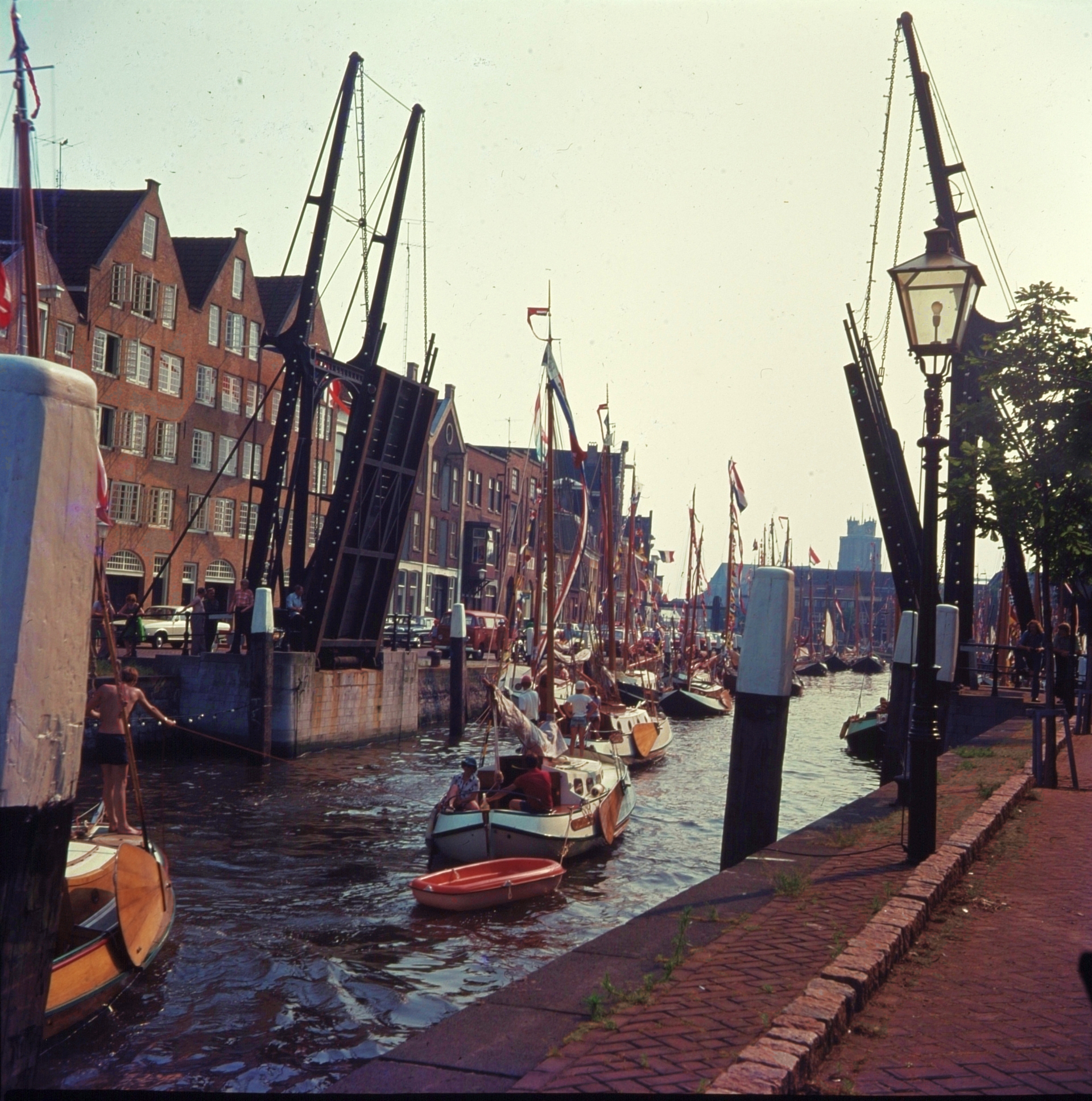 - Pleziervaart in de Wolwevershaven. De Damiatebrug staat open, links de drie bijna identieke pakhuizen aan de Kuipershaven; op de achtergrond de Grote Kerk.