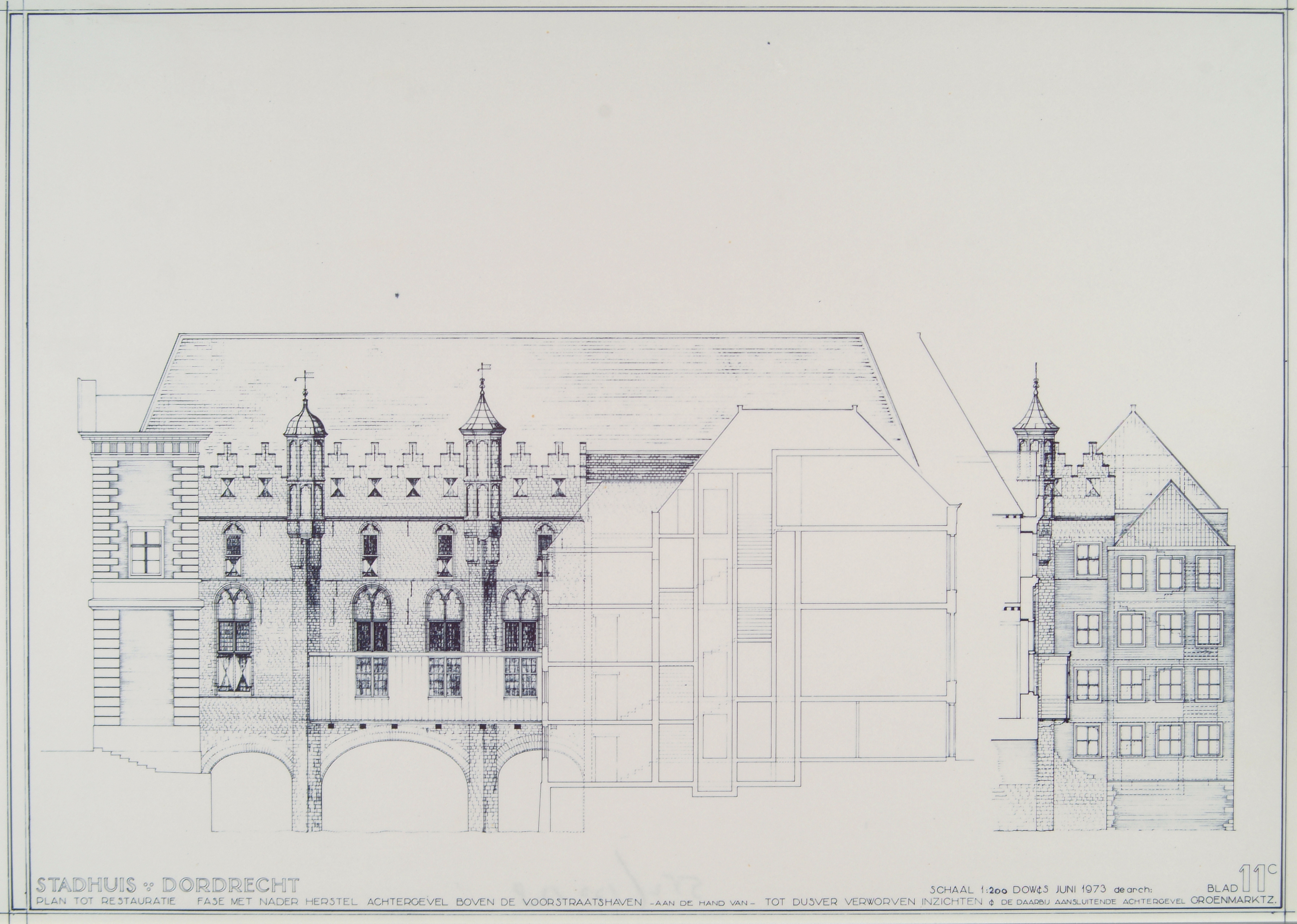 - Tekening van de achtergevel van het stadhuis t.b.v. de restauratie. Betreft de fase met nader herstel van de achtergevel boven de Voorstraatshaven a.d.h.v. tot dusver verworven inzichten en de daarbij aansluitende achtergevel aan de Groenmarktzijde.