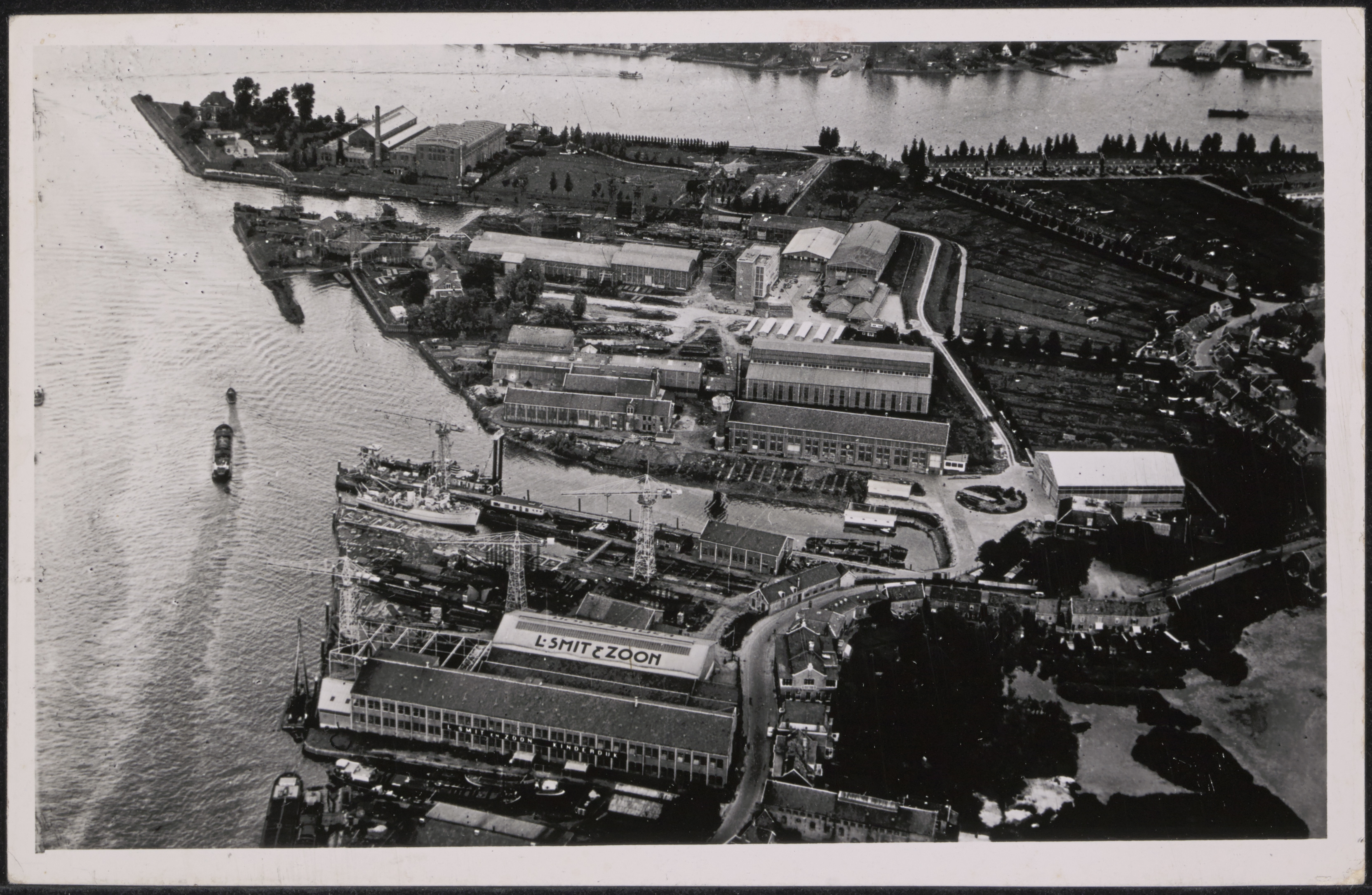 - Luchtfoto van scheepswerf en machinefabriek van J.en K.Smit aan de Molenstraat in Kinderdijk.