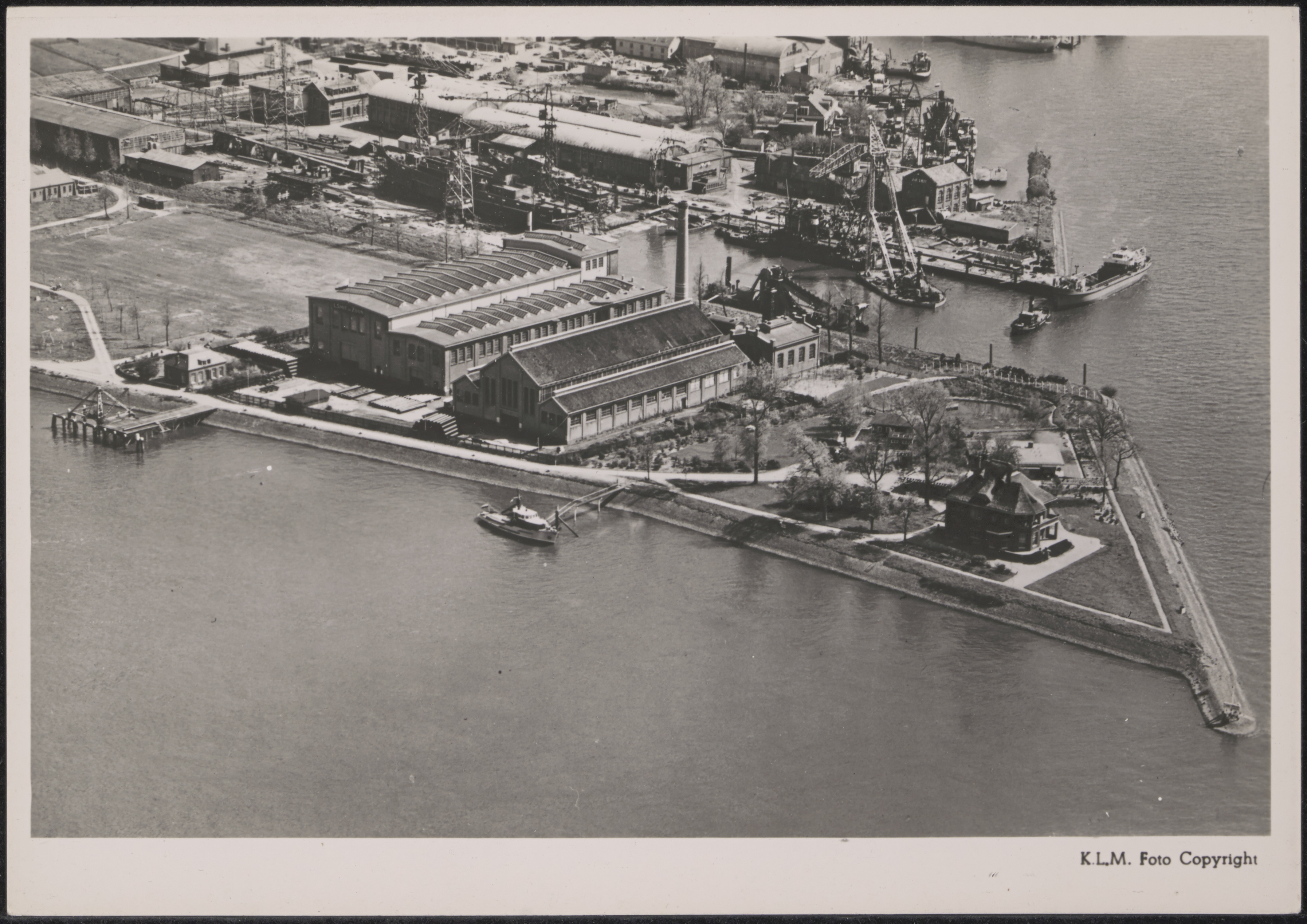 Luchtfoto van scheepswerf en machinefabriek J. en K. Smit. Op de Punt de villa van Leen …