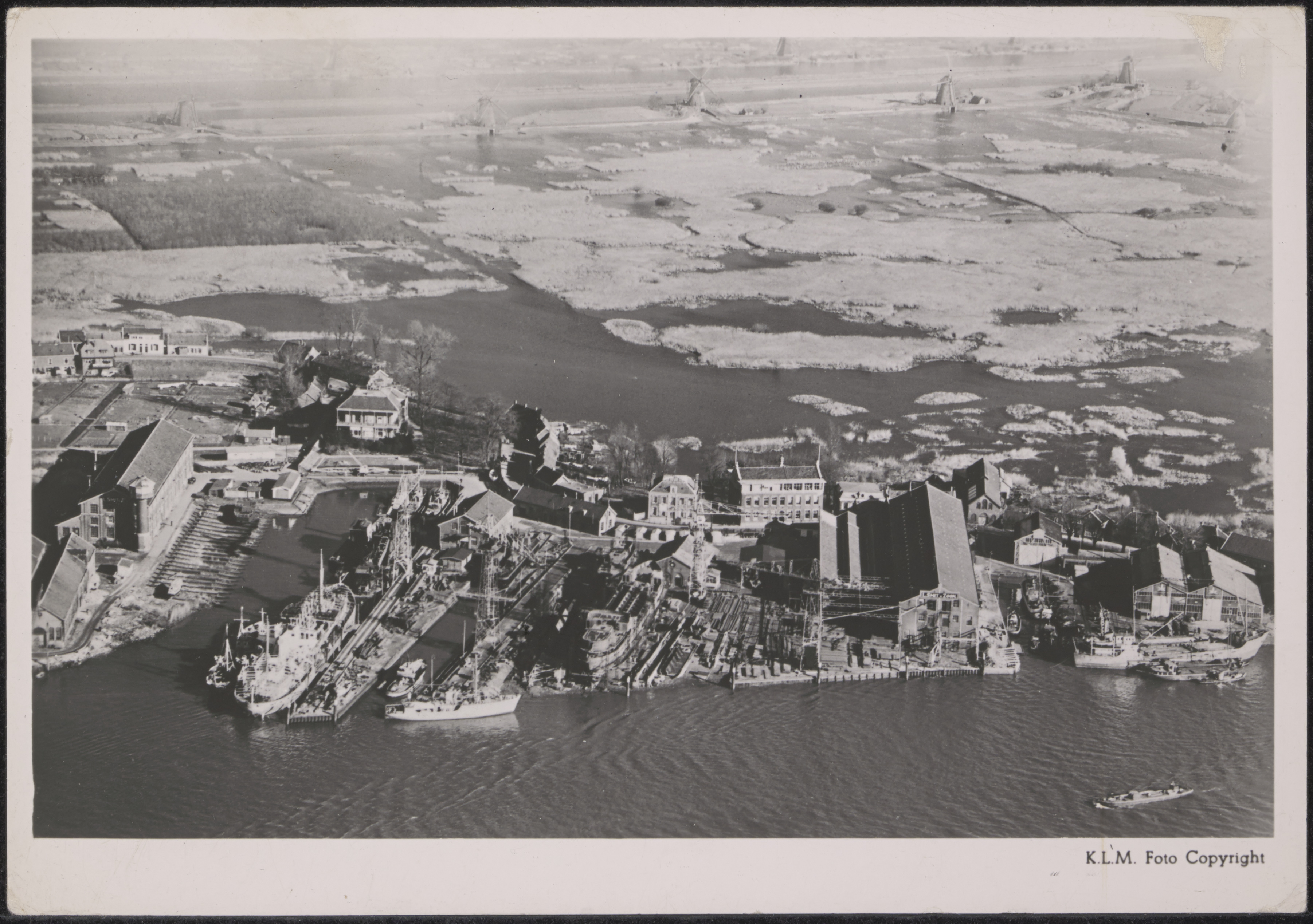 - Luchtfoto van scheepswerf en machinefabriek J. en K. Smit in Kinderdijk.
