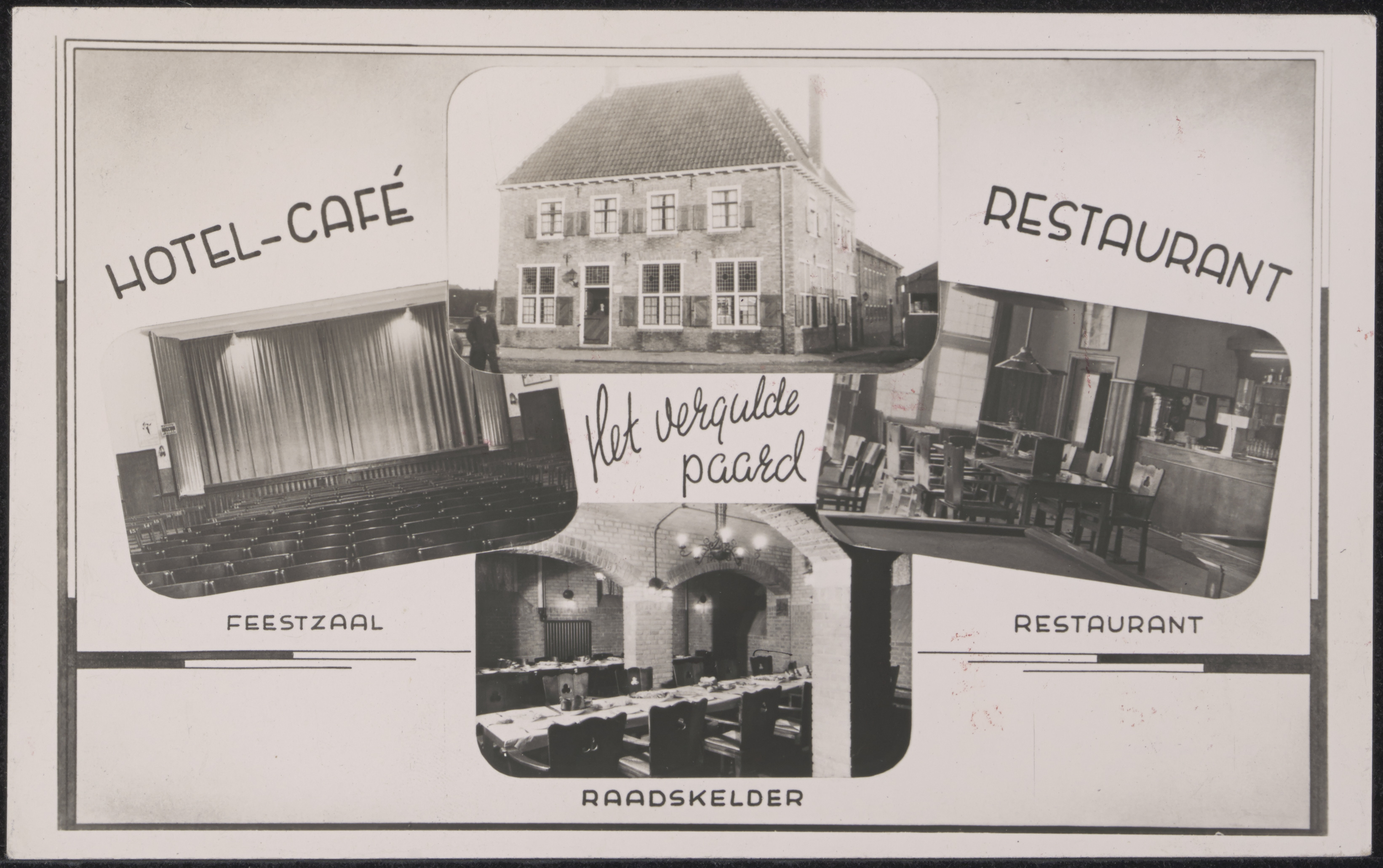 - Reclame van hotel-café-restaurant Het Vergulde Paard op de Dam t.h.v. de Kerksingel in Alblasserdam. .