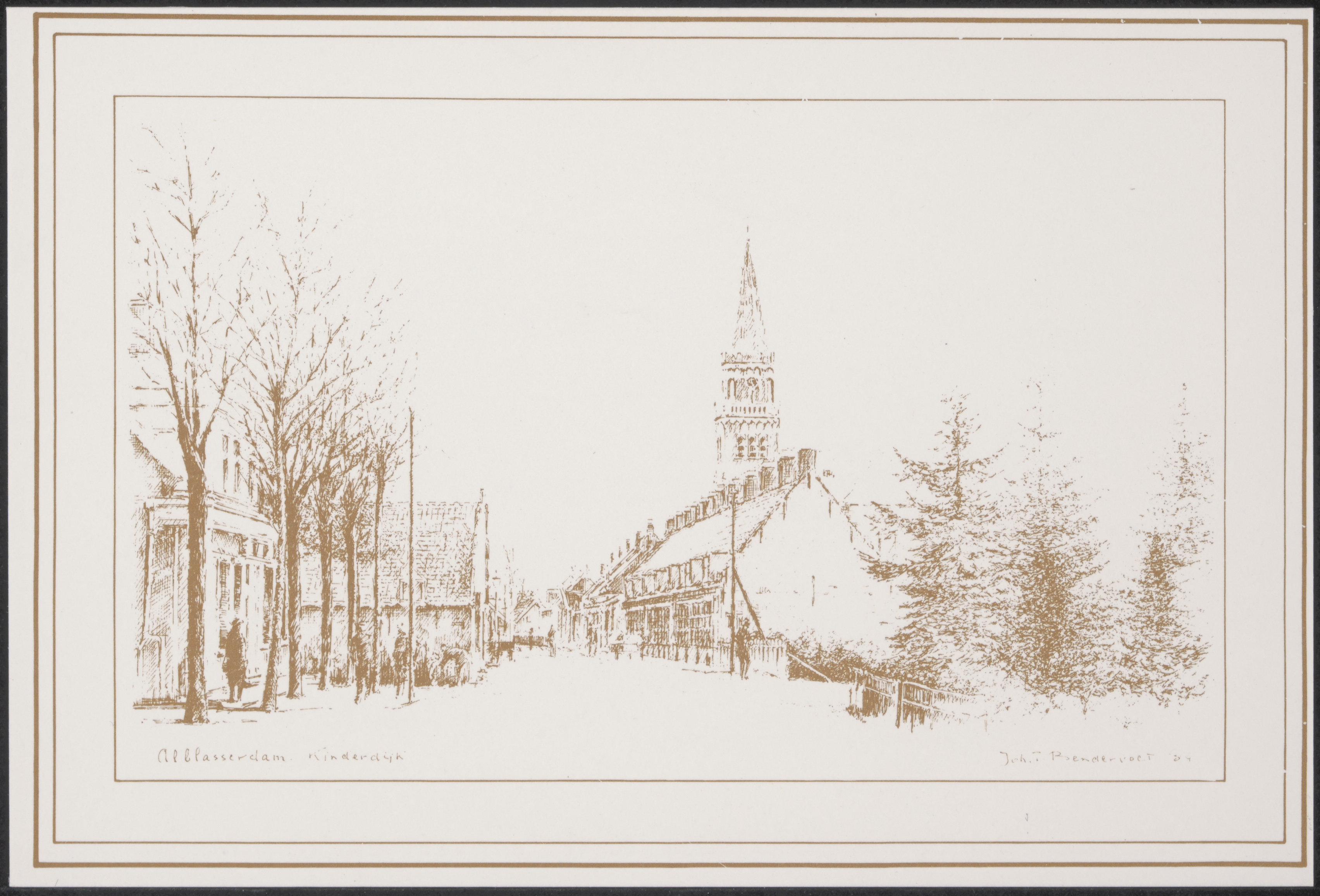 - Tekening door Joh. T. Bendervoet van het Cortgene met de Grote Kerk in Alblasserdam.