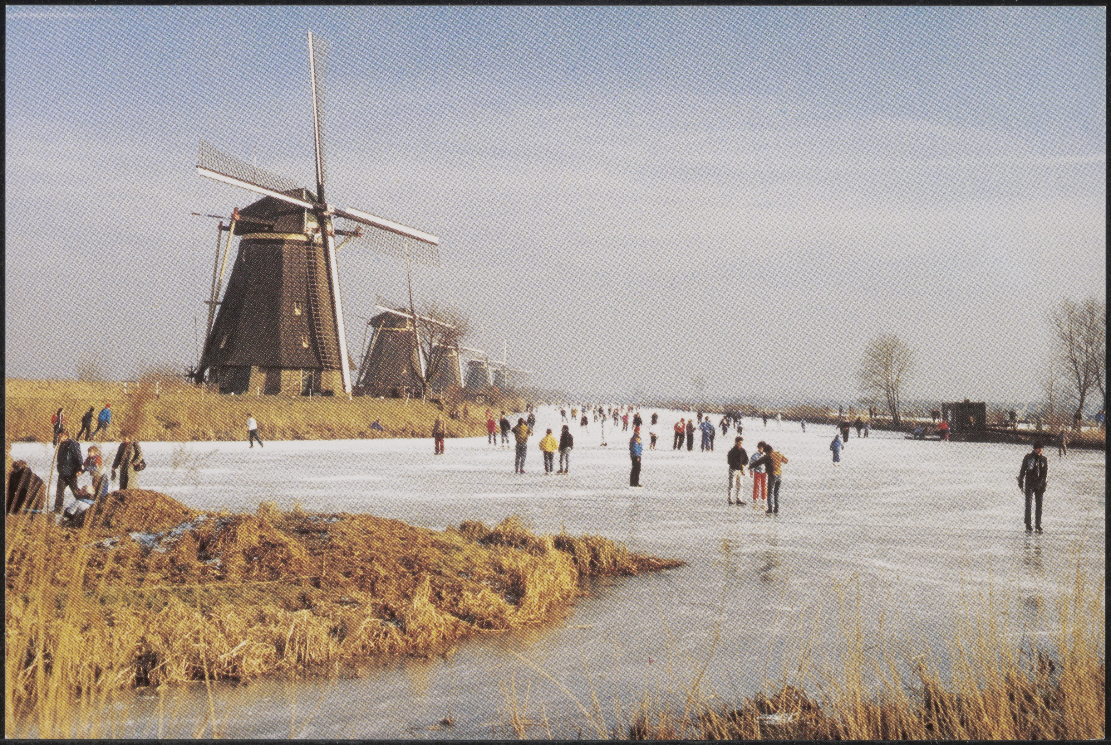 - IJspret op Het Nieuwe Waterschap in Kinderdijk. Molens van voor naar achter: Molen Nederwaard no. 5, no. 4, no.3, Molen Blokweer en Molen Nederwaard no. 1.
