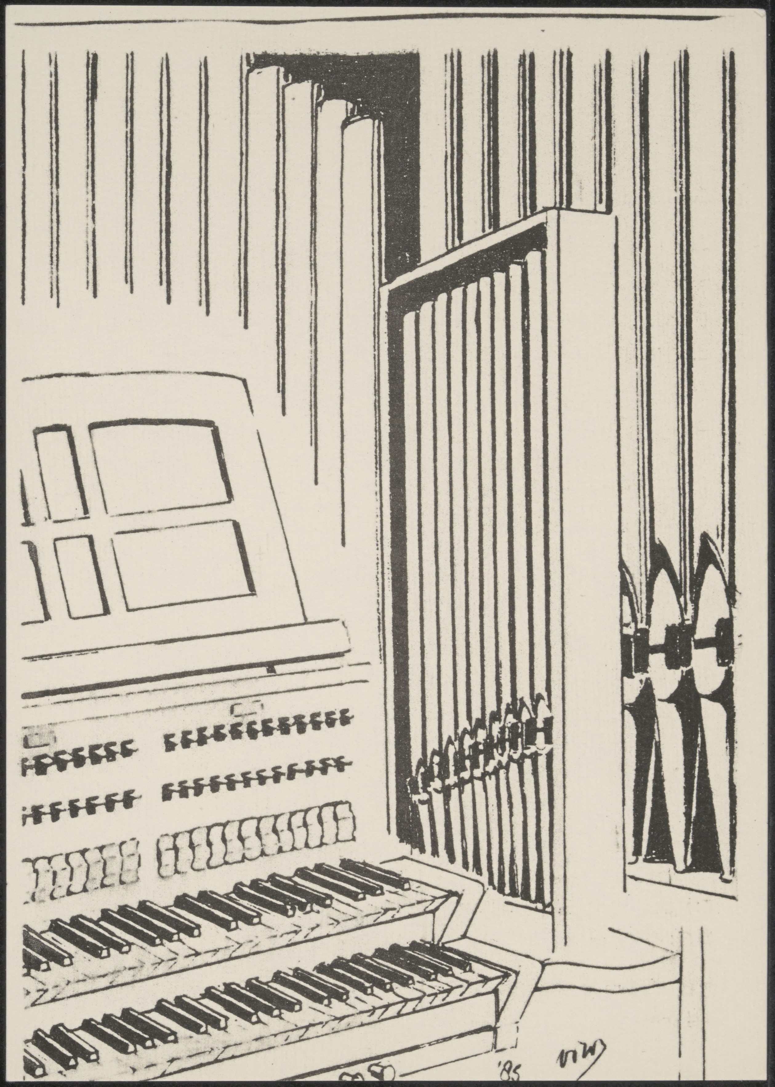 Tekening van het orgel in de Havenkerk aan de Ieplaan in Alblasserdam.
