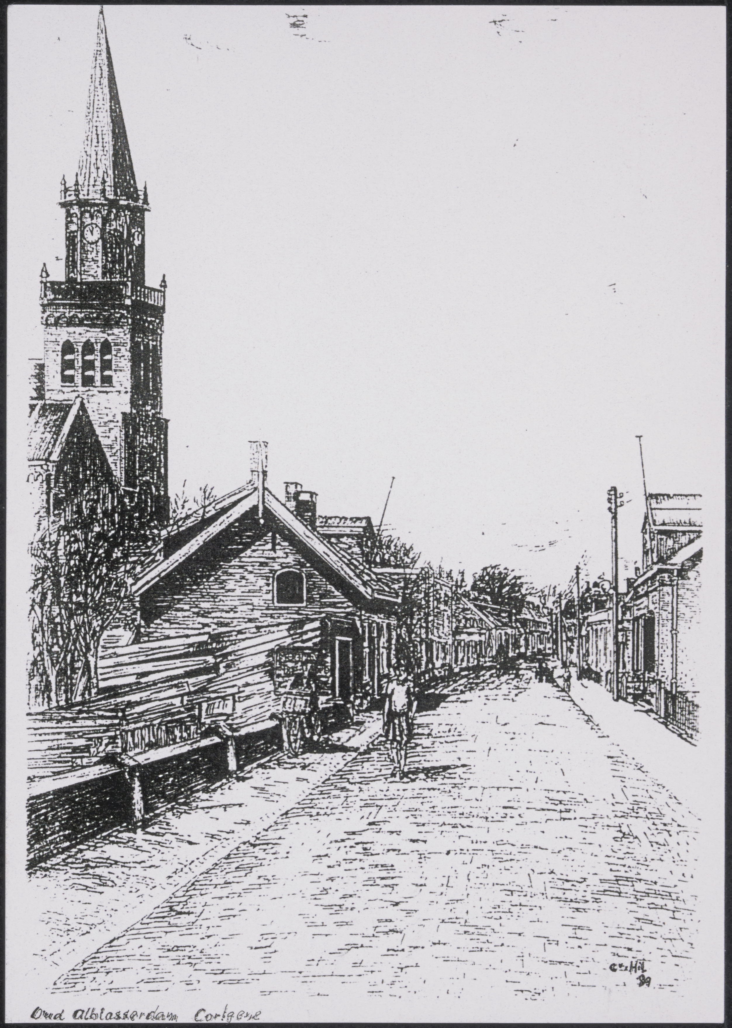 - Tekening van de Grote Kerk en de pastorie aan het Cortgene in Alblasserdam, gezien vanaf de Dam.