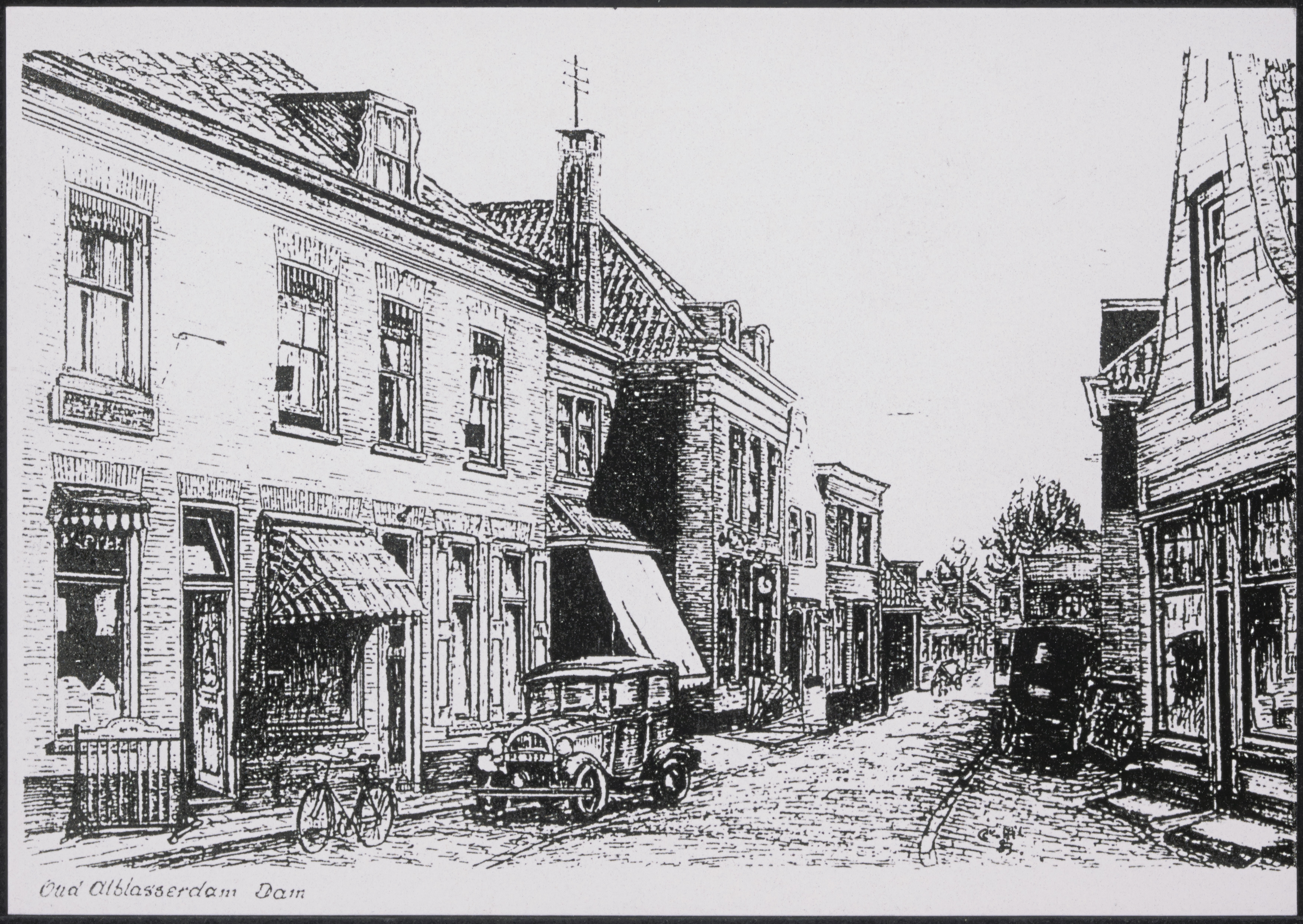 - Tekening van de Dam in Alblasserdam. Achter de auto is het raadhuis.
