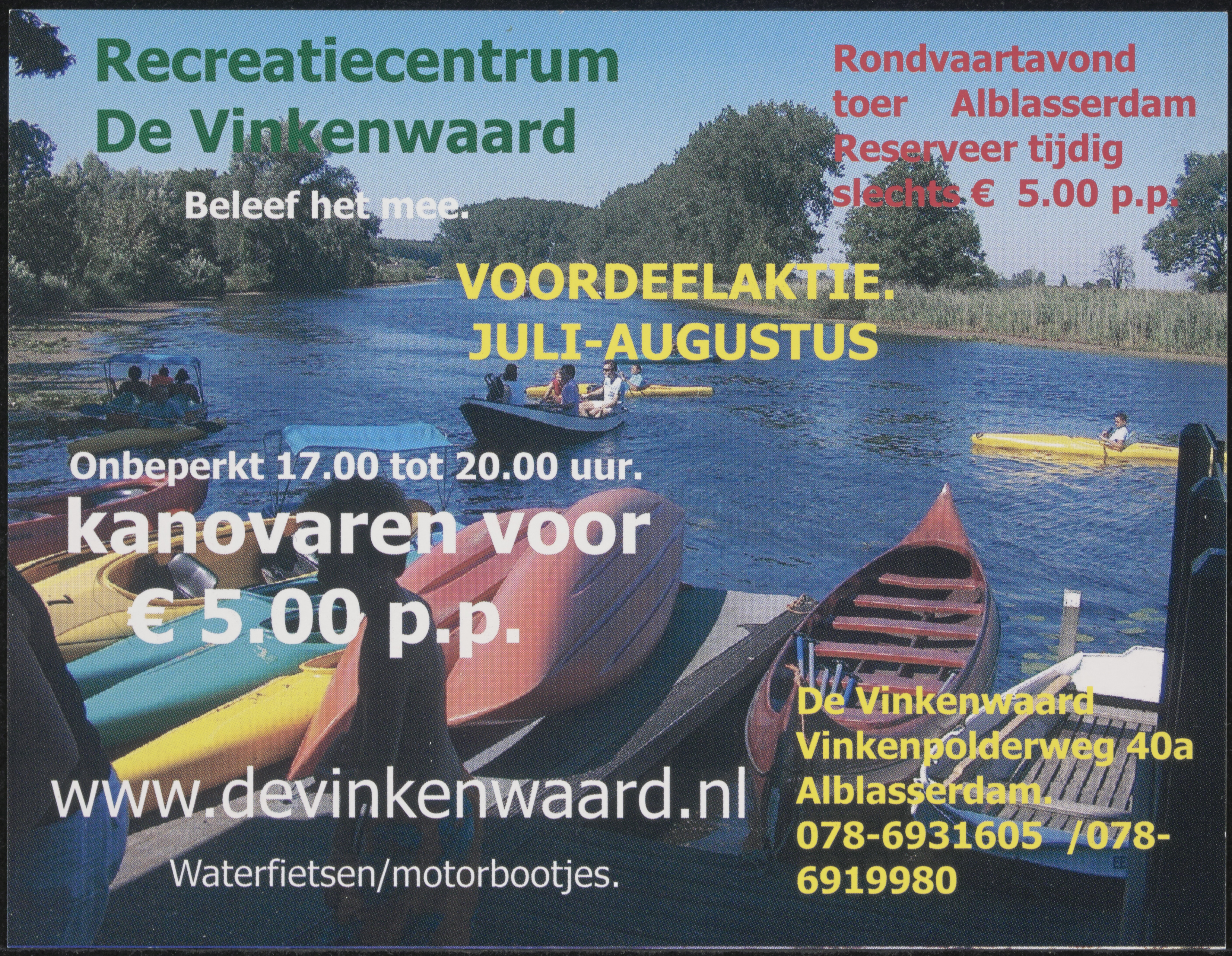 Reclame biljet van recreatiecentrum "de Vinkenwaard "aan de Vinkenpolderweg Alblasserdam.