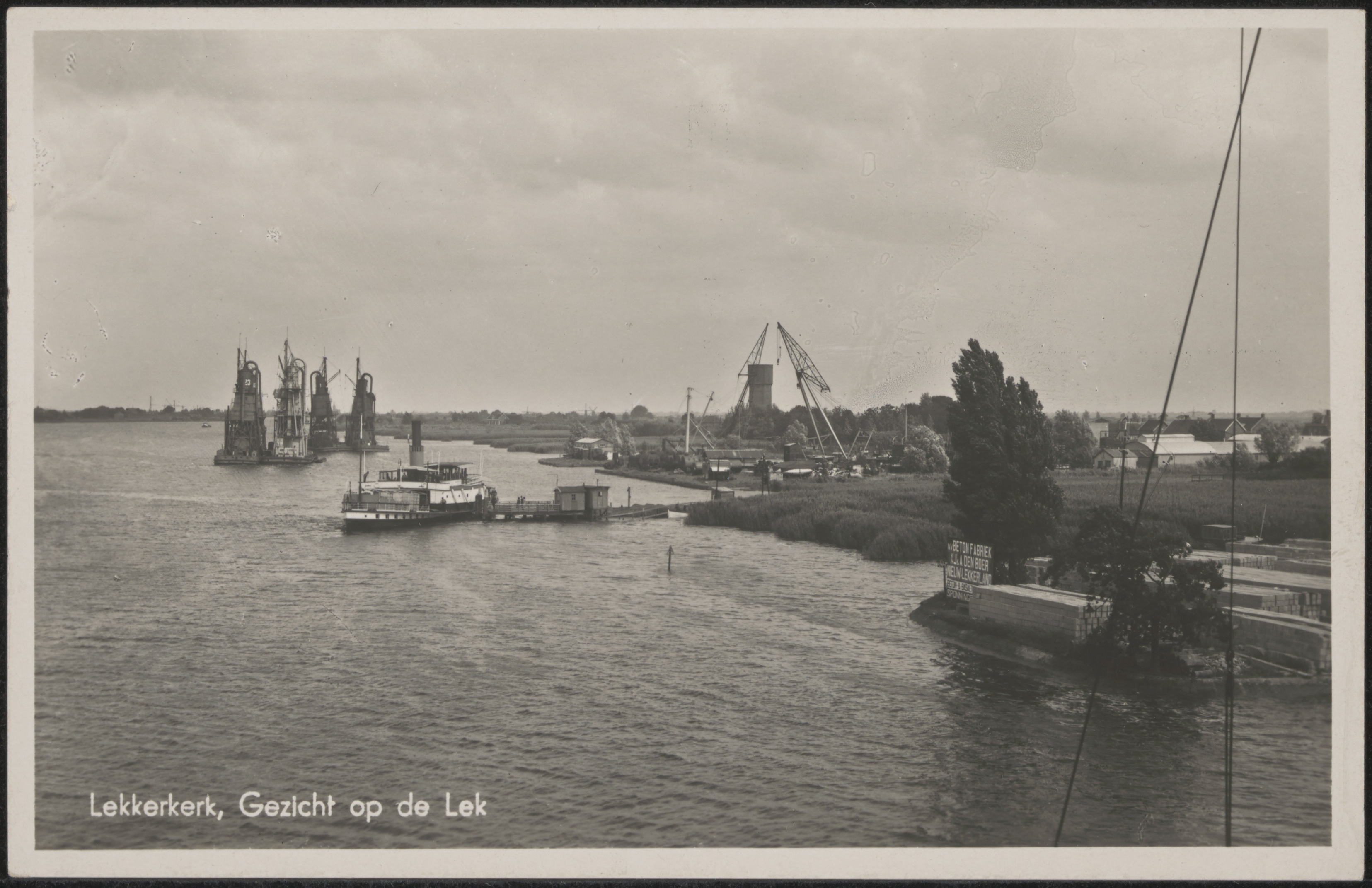 Gezicht op de Lek met rechts Nieuw Lekkerland, links 4 graanelevatoren met er voor een stoomraderboot van Rederij op de Lek. Rechts de watertoren van Nieuw Lekkerland. Rechts onder de betonfabriek van Den Boer.