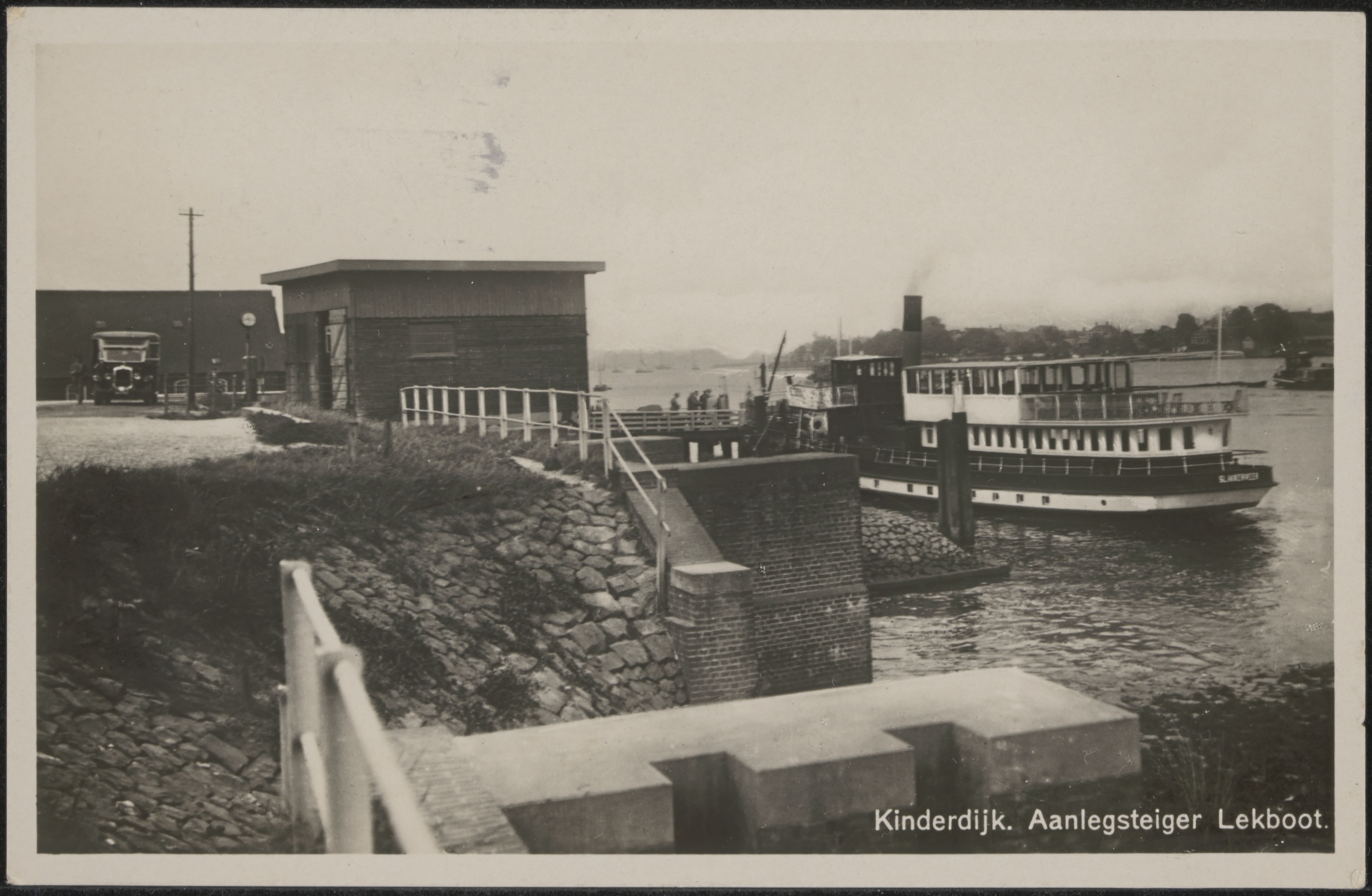 Stoomraderboot Slikkerveer van rederij "Op de Lek" hier bij de aanlegsteiger naast de Elshoutse sluis in Kinderdijk.