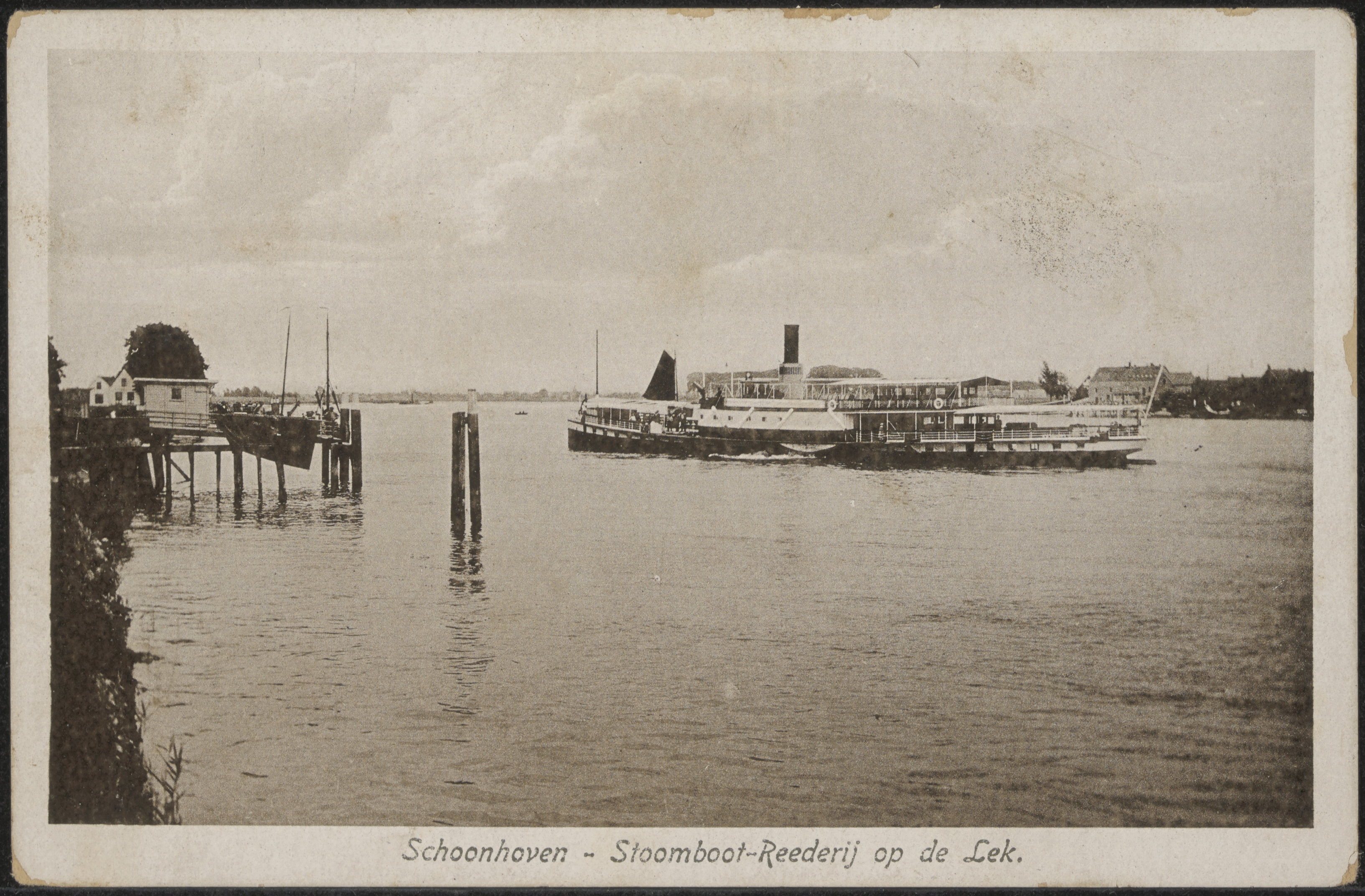 - Stoomraderboot van Reederij op de Lek bij de aanlegsteiger in Schoonhoven. Rechts is Groot-Ammers.
