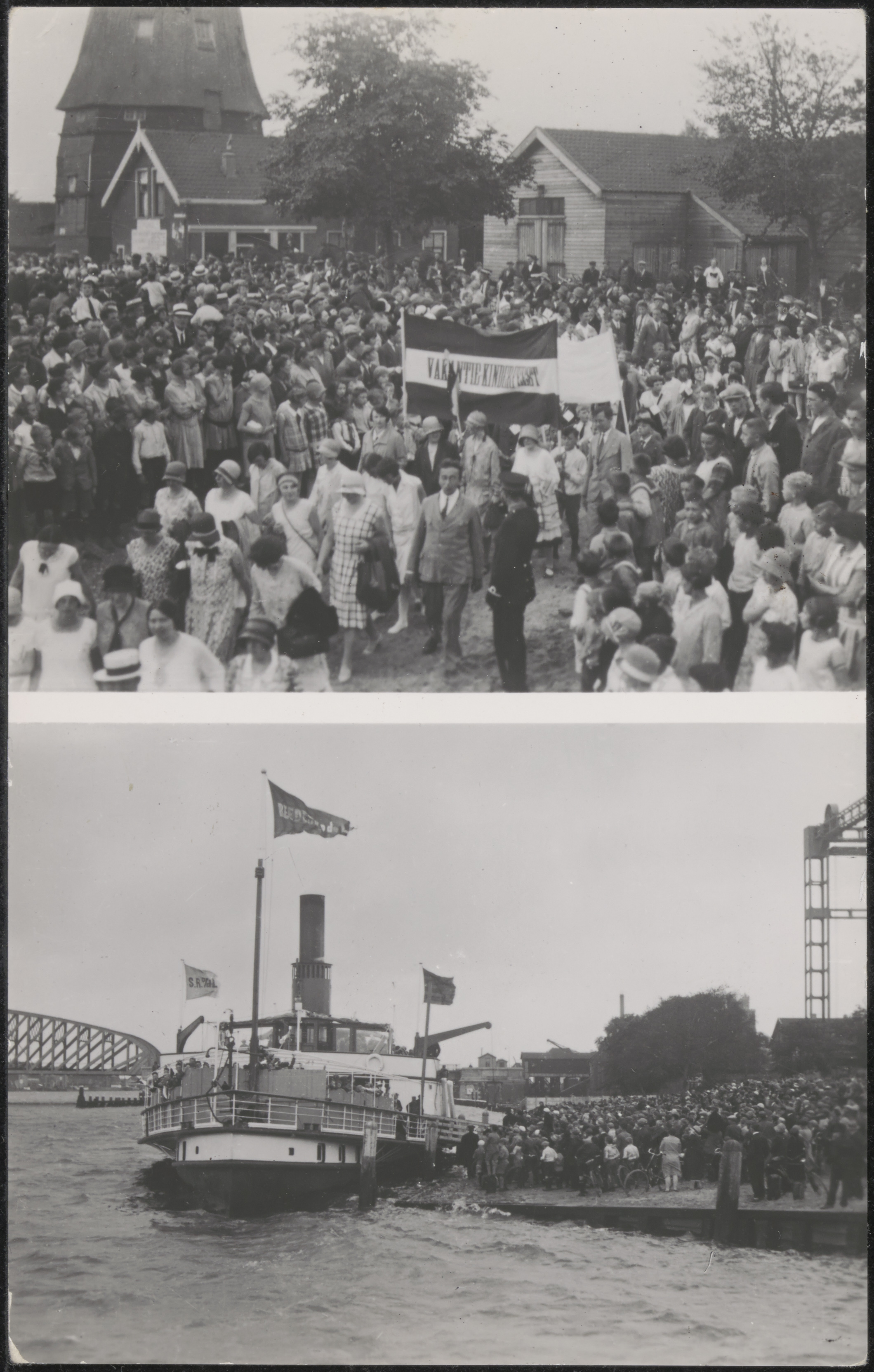 - Vakantie Kinderfeesten. Boven: Handelskade met molen De Pelikaan op de hoek van de Weeskinderendijk. Onder: Stoomraderboot van Reederij op de Lek aan de Handelskade. Links de Zwijndrechtse brug, rechts de Dokbrug.