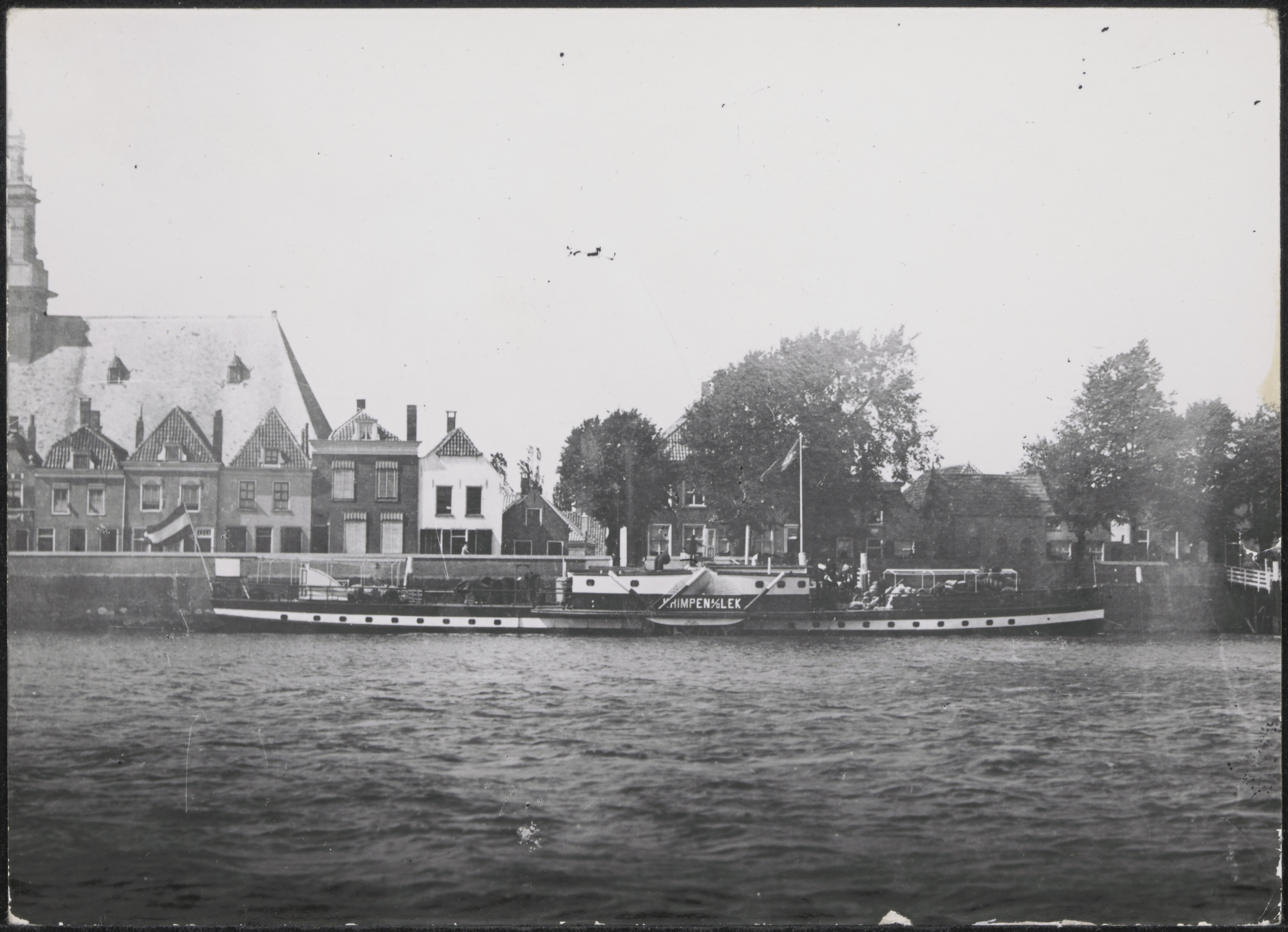 Stoomraderboot Krimpen a/d Lek uit Kinderdijk varend op de Lek t.h.v. de Grote of Johanneskerk op het Kerkplein in Lekkerkerk. De huizen staan aan de Voorstraat.