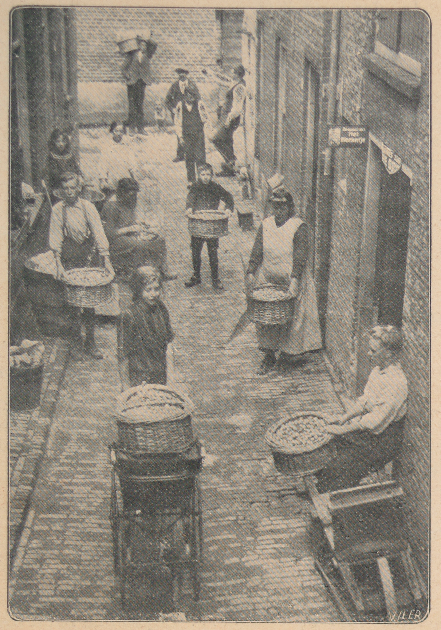 Volgens een mooi artikel (2017) van Jaap Bouman, waren er ook veel sjallotenpellers rondom de Heerheymansuijsstraat, Wijngaardstraat. Bij de foto hierboven wordt de knoopmakersgang genoemd, maar of die gang uitkeek op zo'n 'blinde muur', weet ik niet. Het uithang-reclamebordje rechts ; Het Bleekertje zegt misschien nog iets..