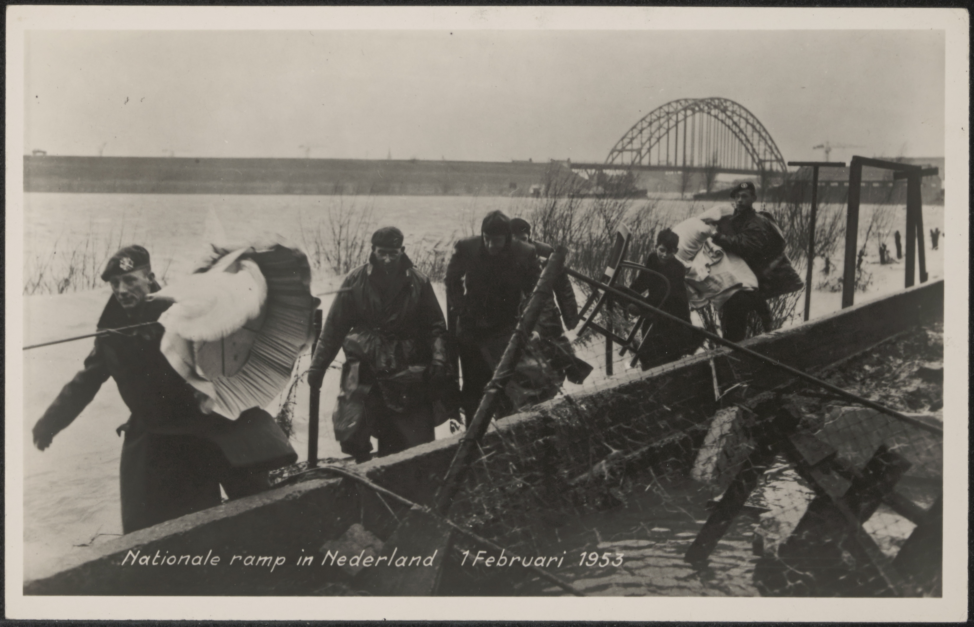 Watersnood in H.I.Ambacht met op de achtergrond de oprit van de brug over de Noord naar Alblasserdam. Rechts is de kabelfabriek.