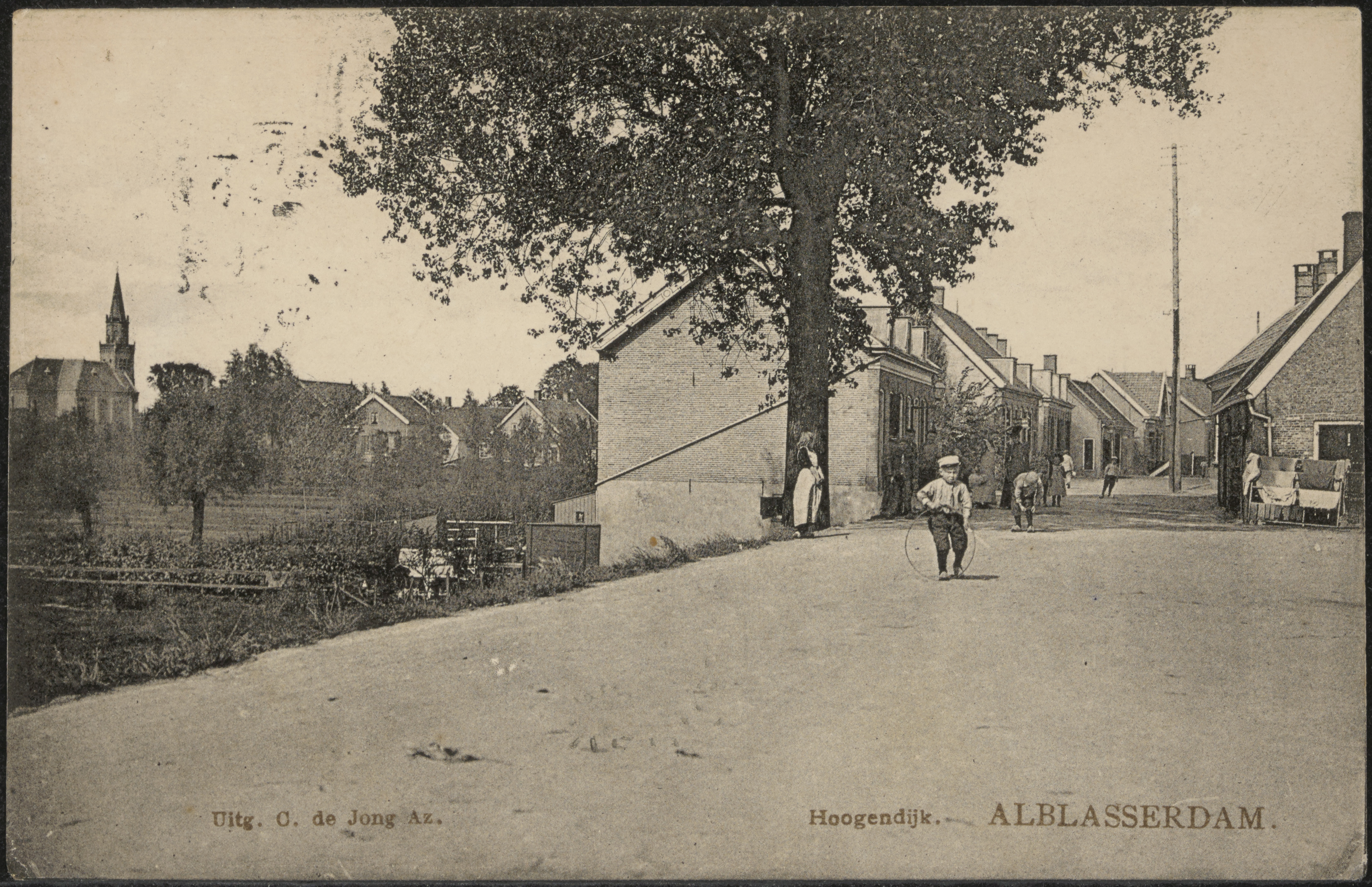 Hoogendijk in Alblasserdam. Links de Grote Kerk aan het Cortgene.