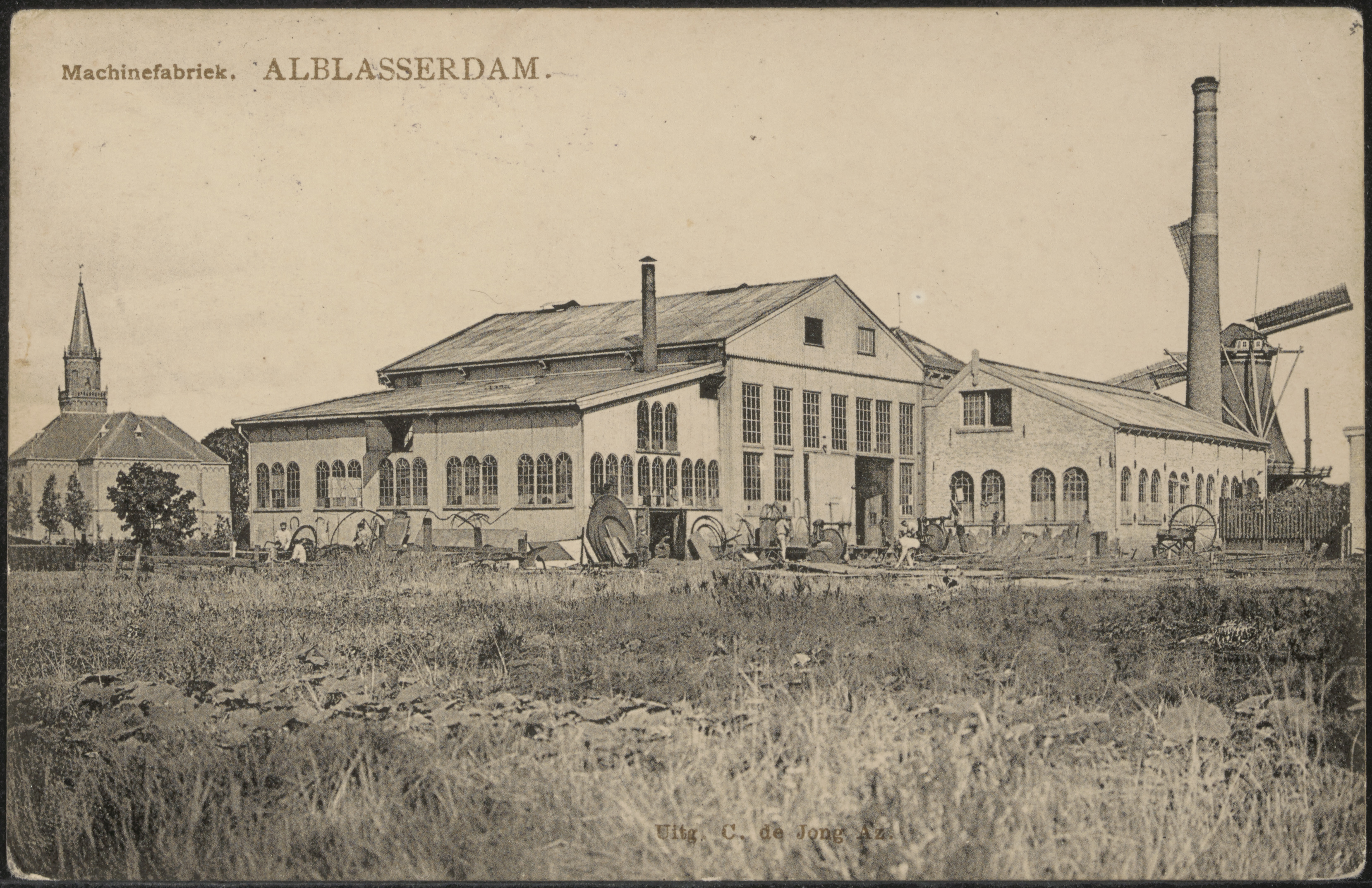 - Machinefabriek van F.H.van der Lee en molen De Hoop aan het Zuiderstek in Alblasserdam. Links de Grote kerk aan het Cortgene.