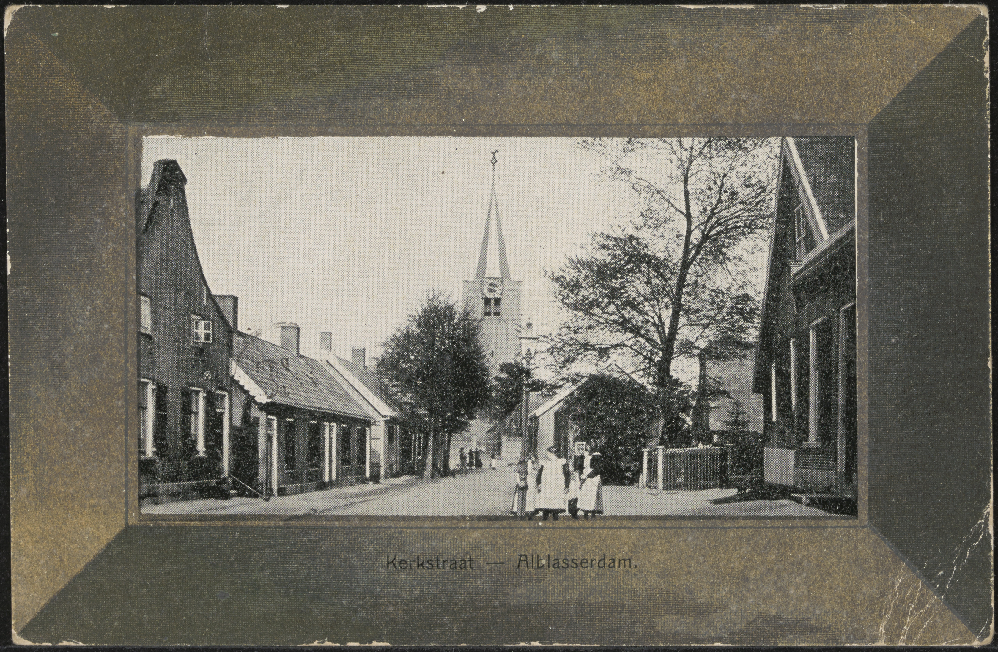 Kerkstraat , links is nummer 108 met op de achtergrond de Oude Toren in Alblasserdam.