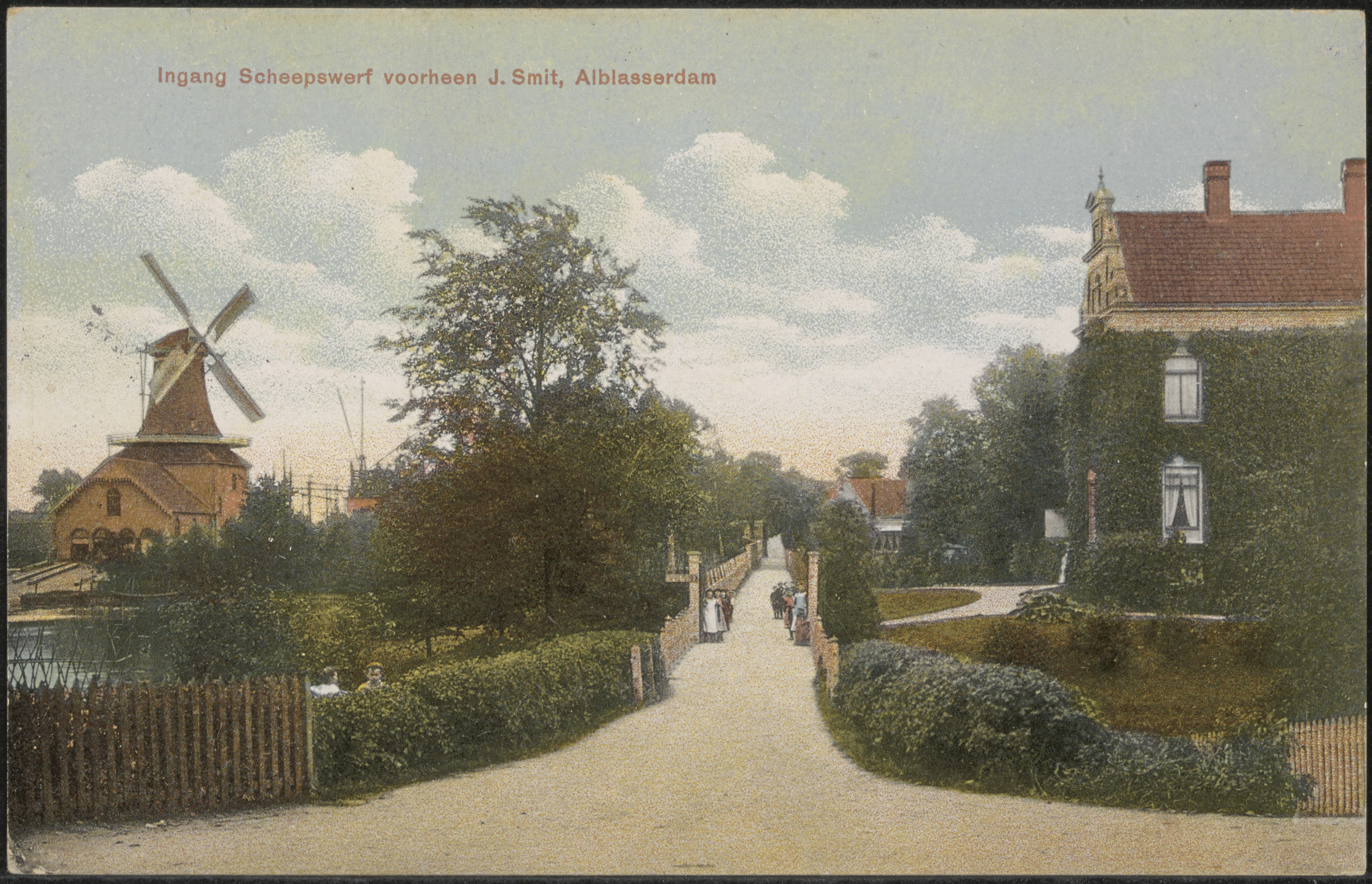 eerste Kade vanaf Cortgene met ingang naar de Oude Werf en rechts villa van Hendrik Smit en links de houtzaagmolen "Ons Genoegen"in Alblasserdam.
