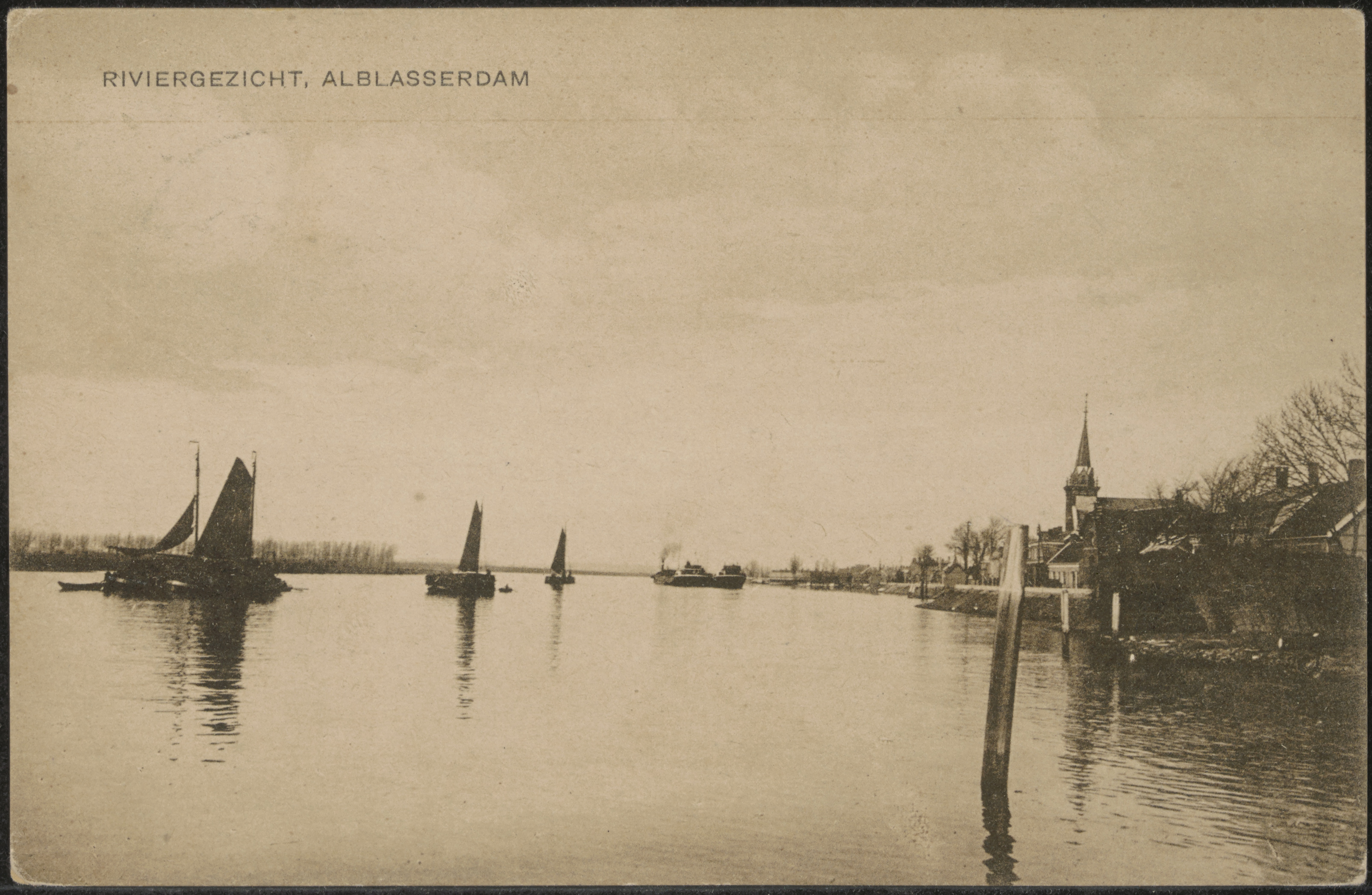 De Noord met rechts de Oost Kinderdijk thv "Het Melkhoofdje" en de Gereformeerde kerk. in Alblasserdam.