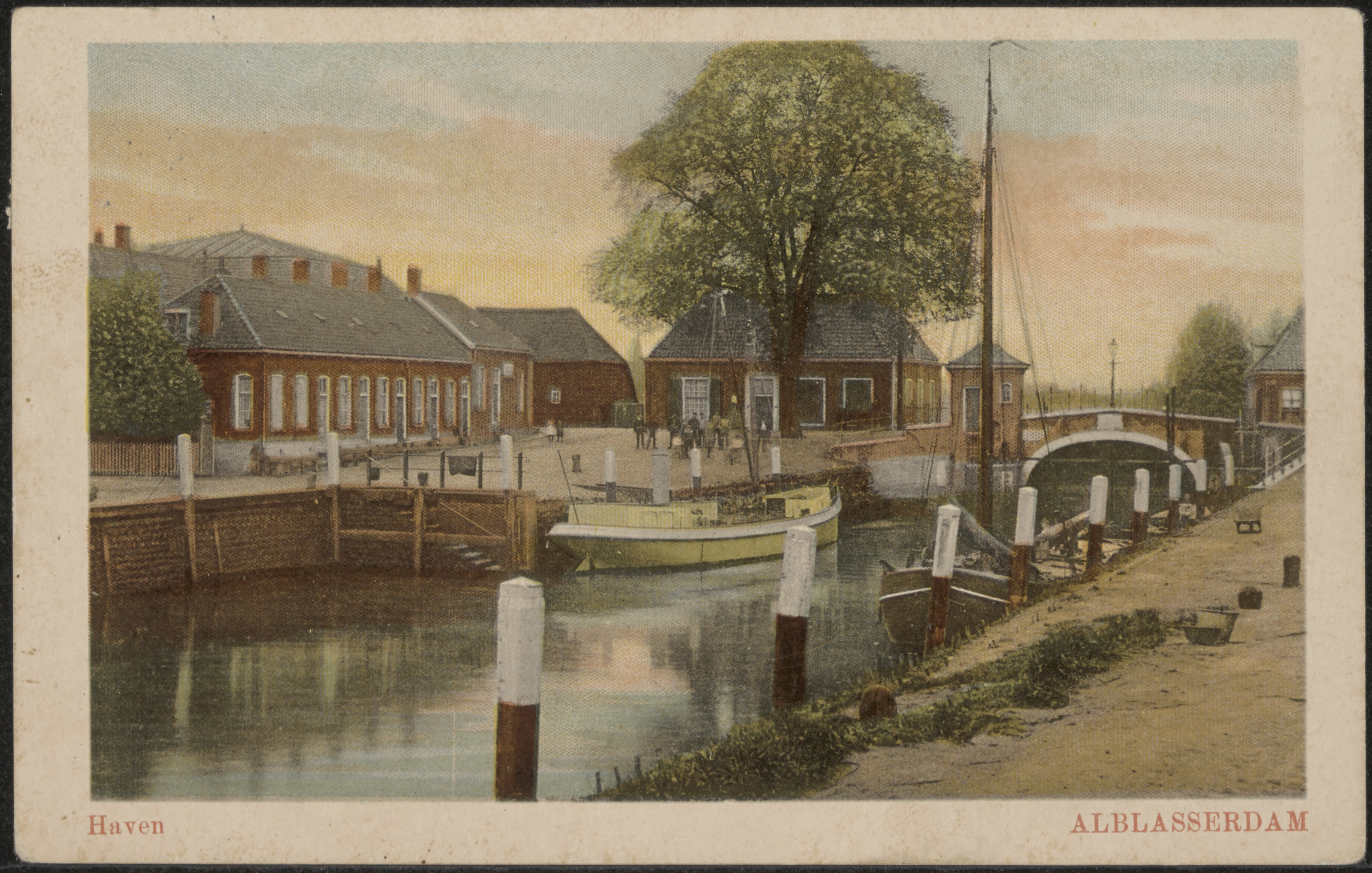 - De Buitenjachthaven gezien vanaf het Zuiderstek richting de sluis en het Waardhuis van de Nederwaard op de Dam in Alblasserdam.