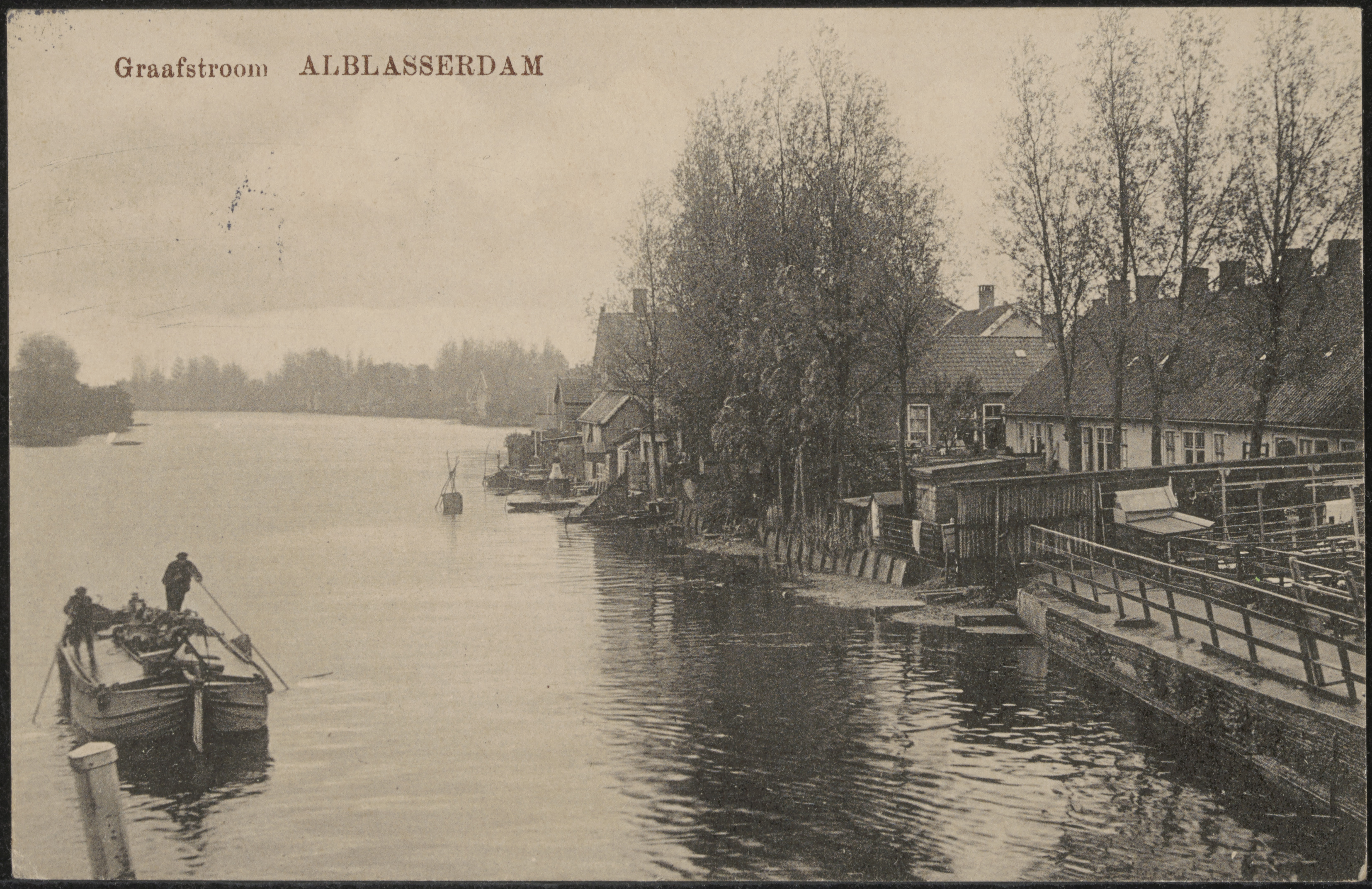 Vanaf de sluis zicht op de Alblas met rechts de Polderstraat in Alblasserdam.