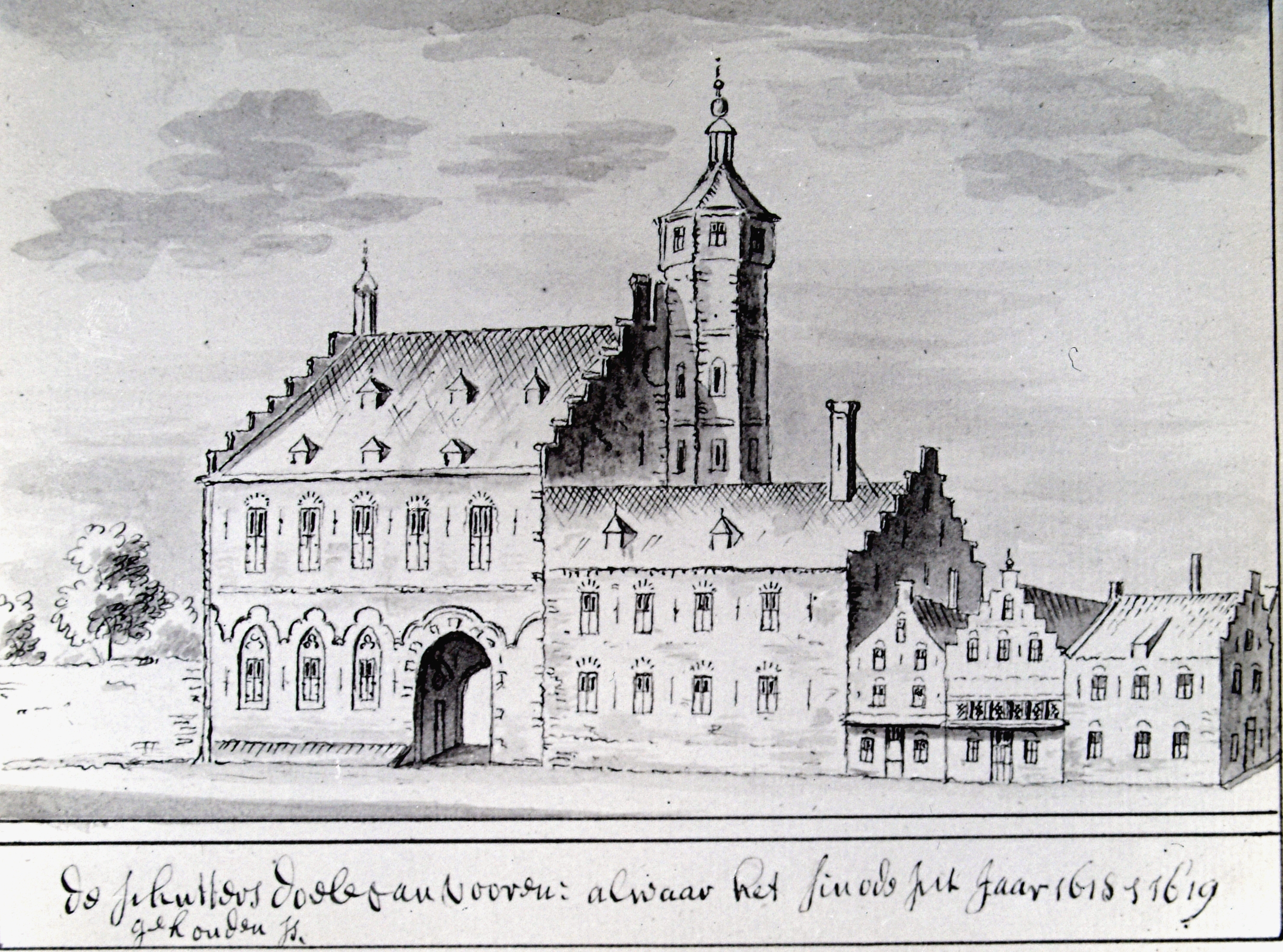Kloveniersdoelen aan de zijde van de Doelstraat met de zgn. "Draaiom", een tafel boven in de torenkamer die kon draaien. Tekening in Oost-Indische inkt door E.H. Schoemaker 1987 naar een tekening in de verzameling. stads- en dorpsgezichten van A. Schoemaker, Amst 1730. Bibl.Kon.Oudh.K.Gen. (13,5x18,2 cm). Gesloopt in 1857.