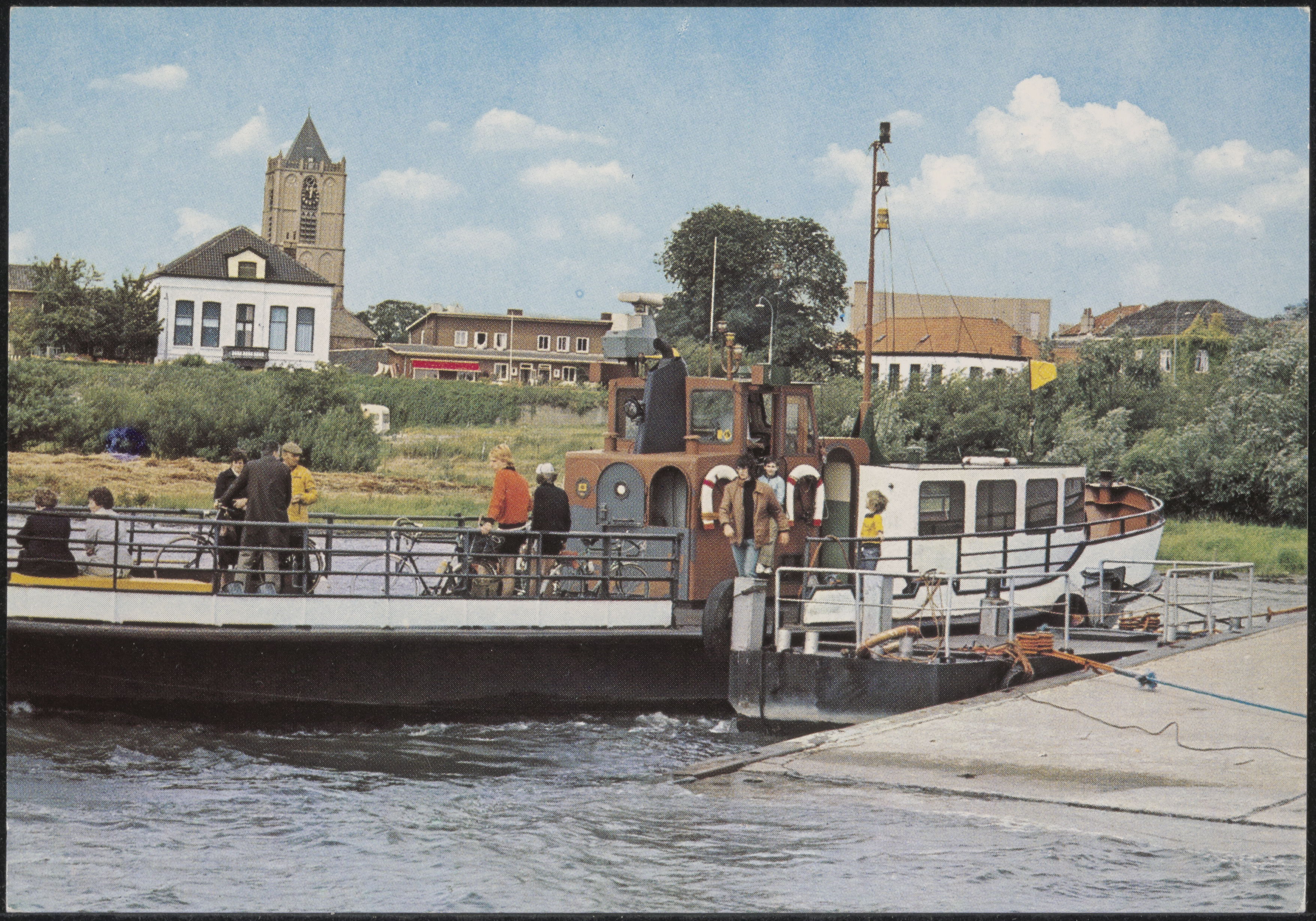 Op de voorgrond veerboot Tiel-Wamel met zicht op de Ophemertsedijk en de St.Maartenskerk in Tiel.