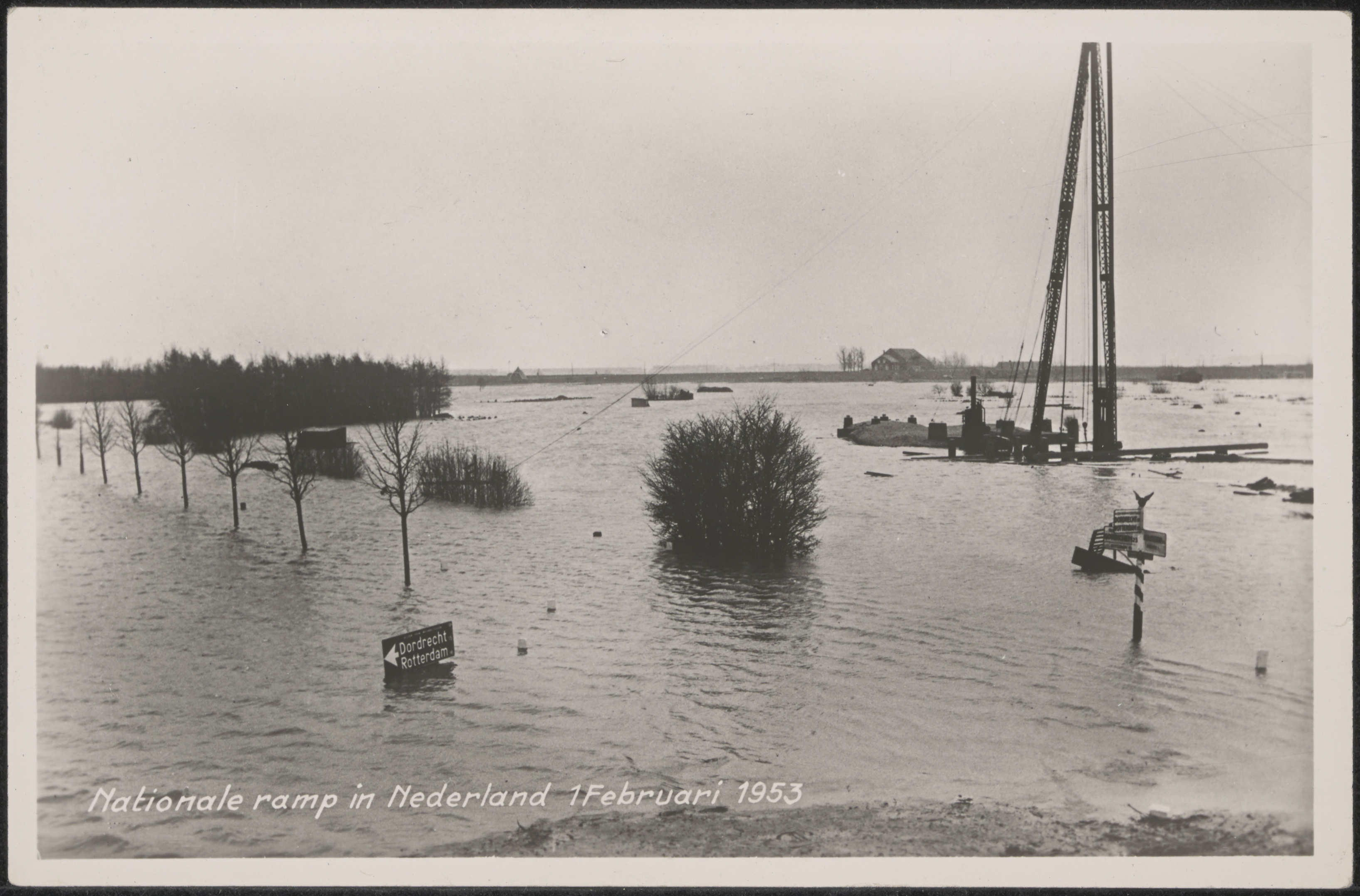 Watersnood febr.1953, links van deze foto is de oprit van de brug over de Noord.Waar de heistelling staat wordt het hoogspanningsstation gebouwd voor de Kabelfabriek in Alblasserdam.