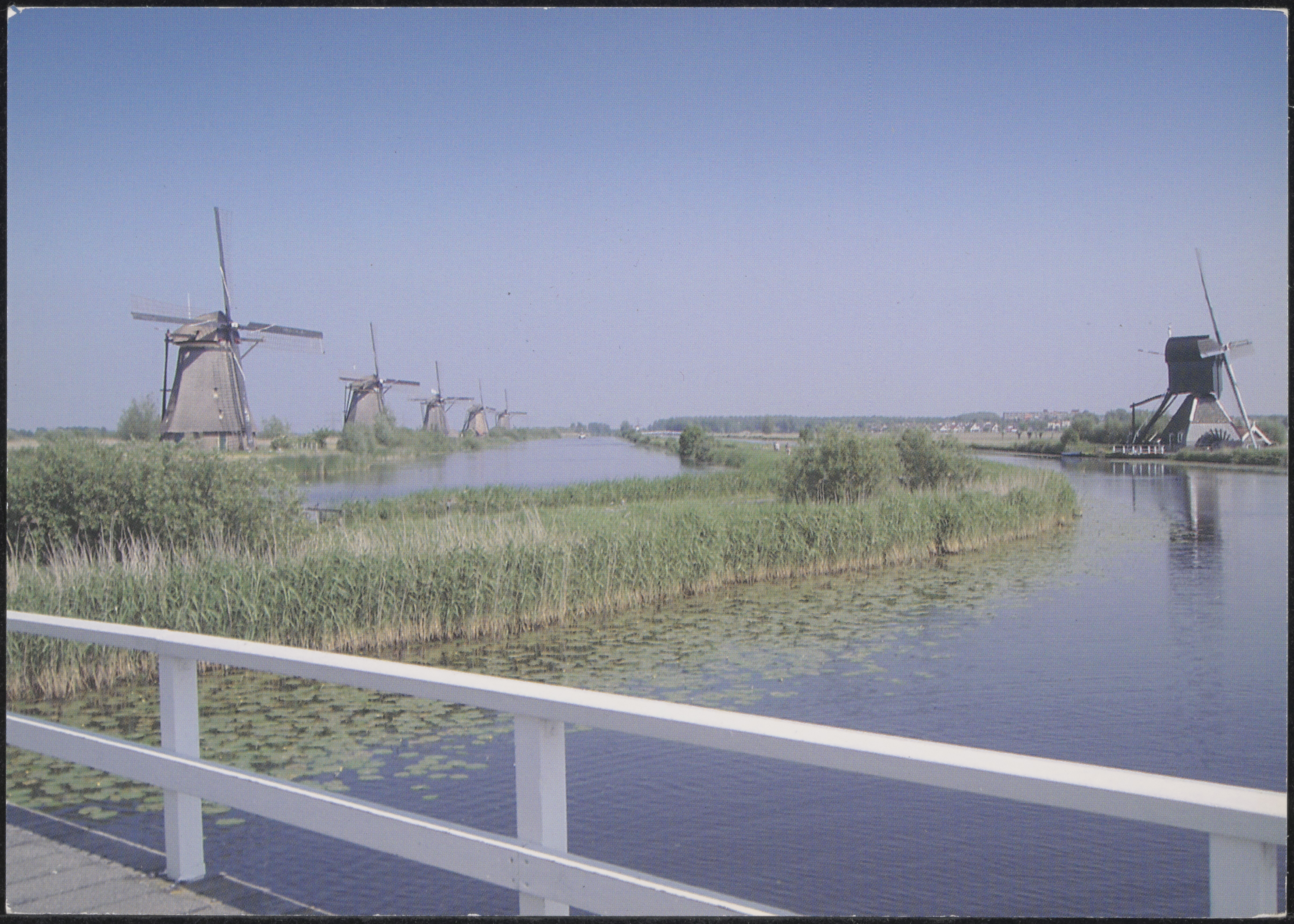 - Rechts museummolen Blokweer aan de Blokweerschekade in Alblasserdam. met en Links de molens aan de Molenkade Overwaard in Kinderdijk. Gezien vanaf de brug over Het Nieuwe Waterschap.