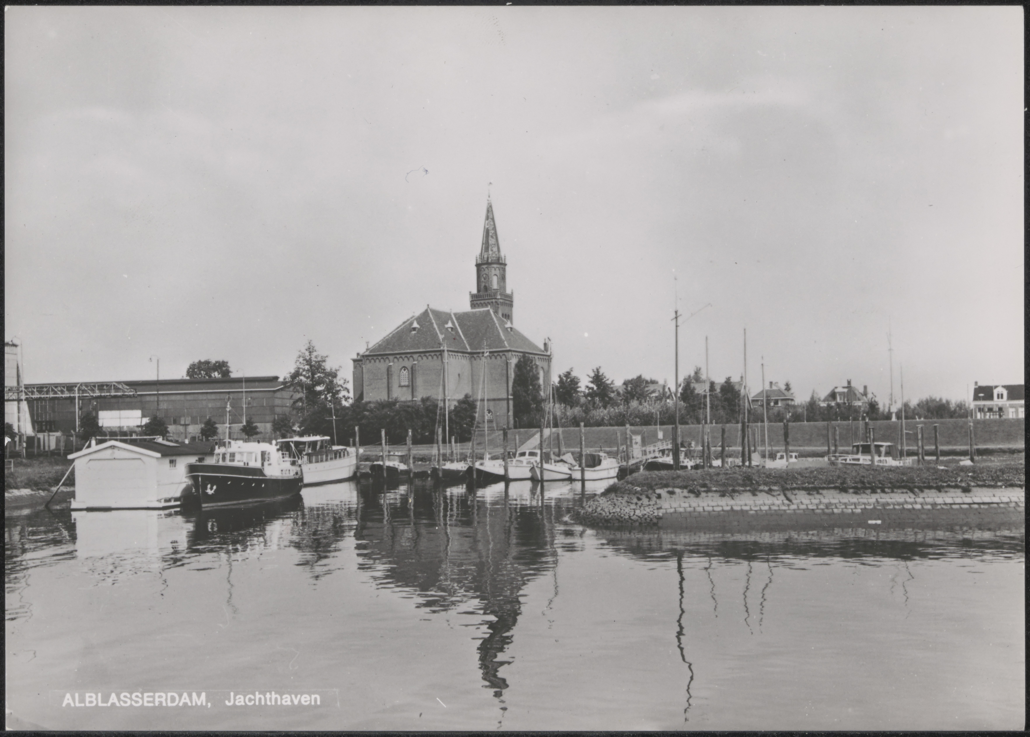 De Buitenjachthaven vanaf het Zuiderstek richting Grote Kerk in Alblasserdam.
