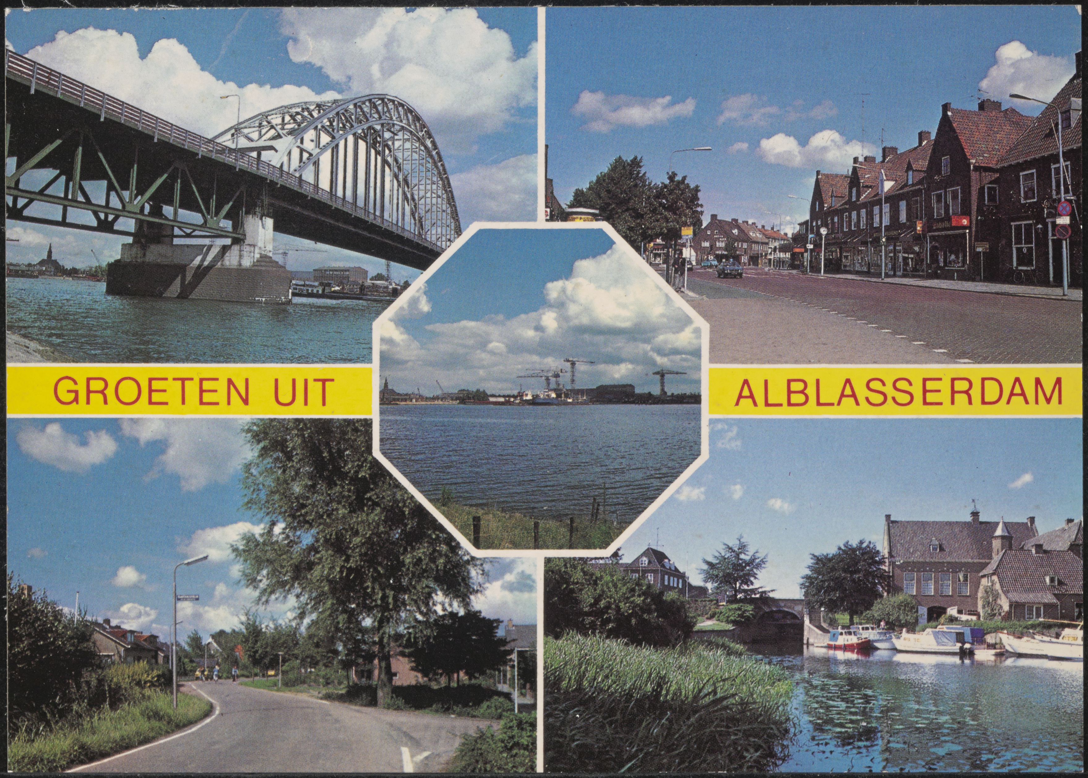 - Alblasserdam. Linksboven: Brug over de Noord. Rechtsboven: De Dam richting Plantageweg. Midden: Scheepswerf. Linksonder: De Vinkenpolderweg. Rechtsonder: De sluis en het Waardhuis van de Nederwaard op de Dam.