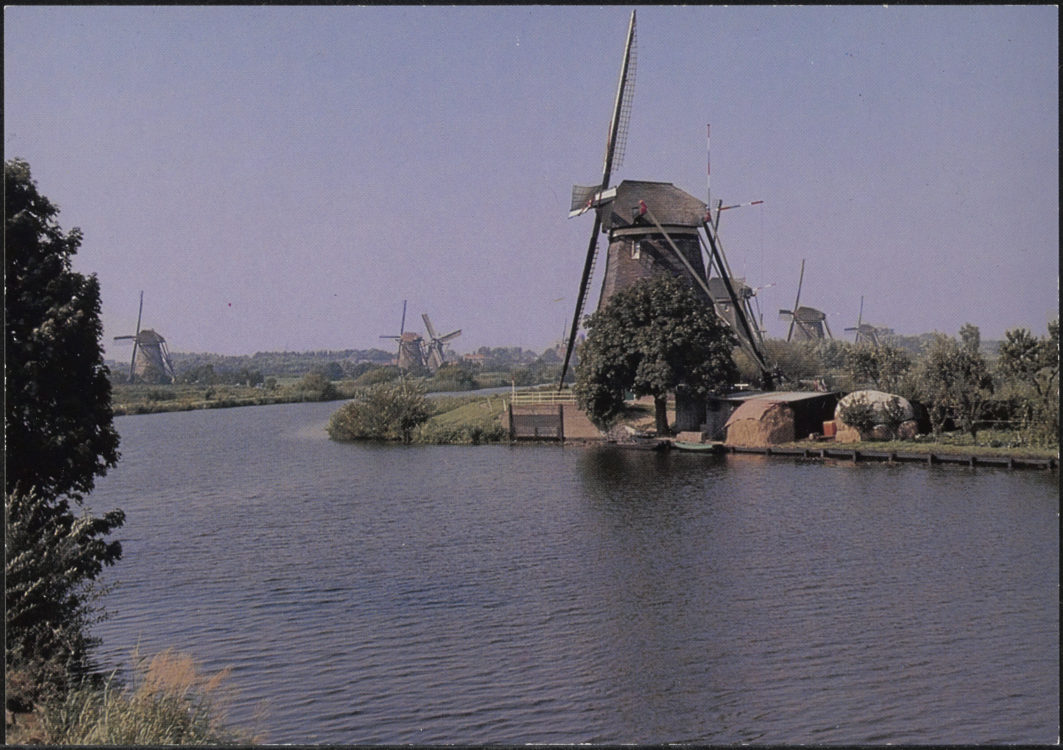 - Molens in Kinderdijk. Links aan de Molenkade Nederwaard en rechts aan de Molenkade Overwaard. Op de voorgrond Molen Overwaard no. 1.