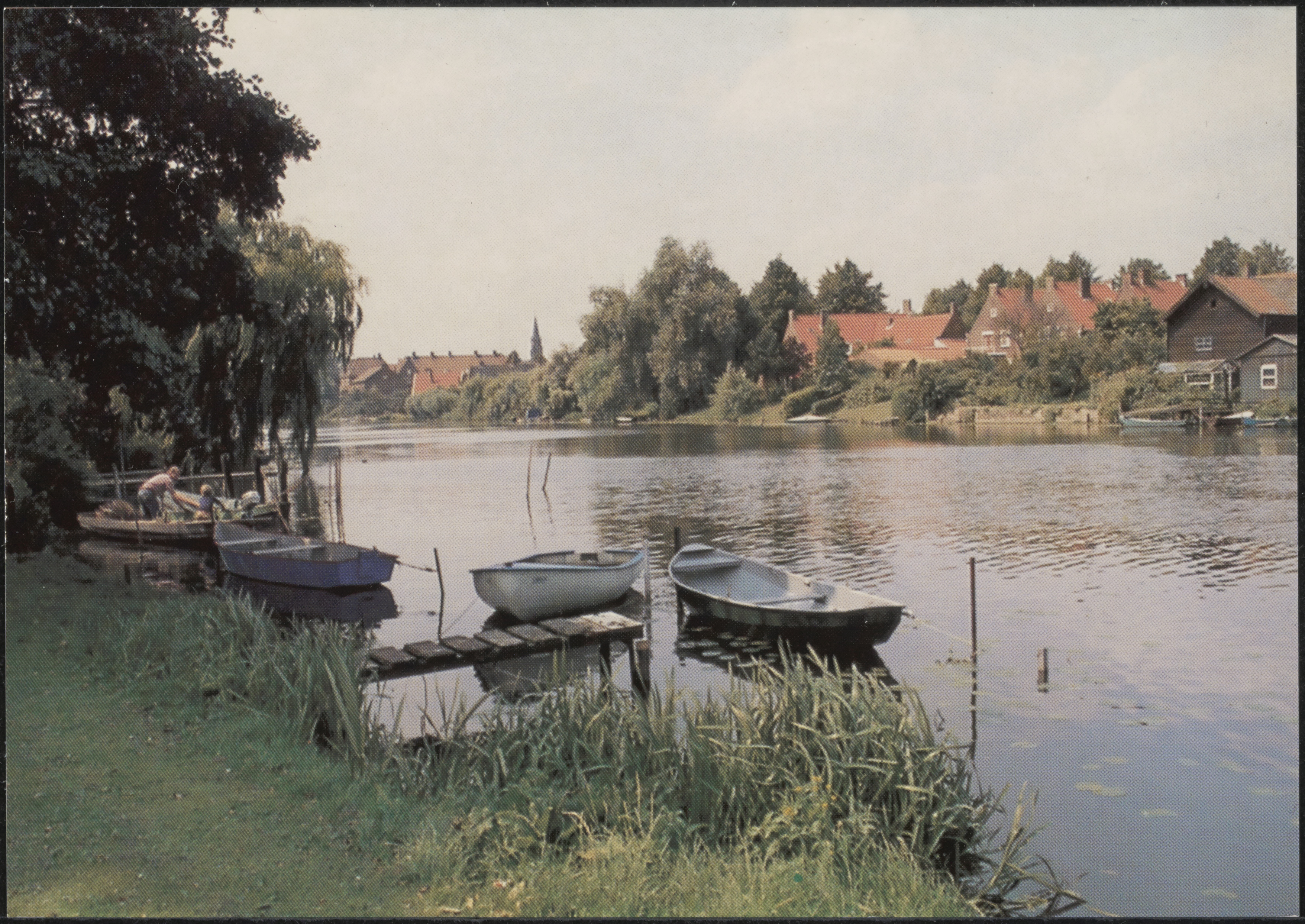 Vanaf de Polderstraat zicht op de Alblas met de Kerkstraat er achter en op de achtergrond de torenspits van de Grote kerk in Alblasserdam.