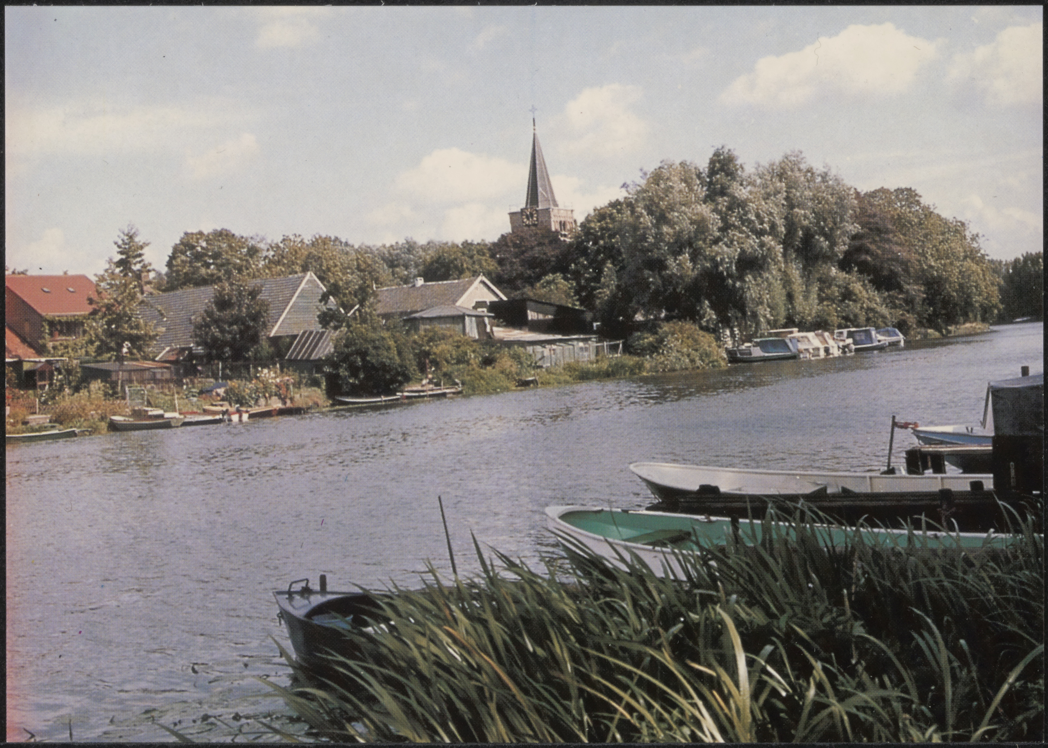 De Kerkstraat met de Oude Toren, gezien vanaf de Polderstraat over de Alblas in …