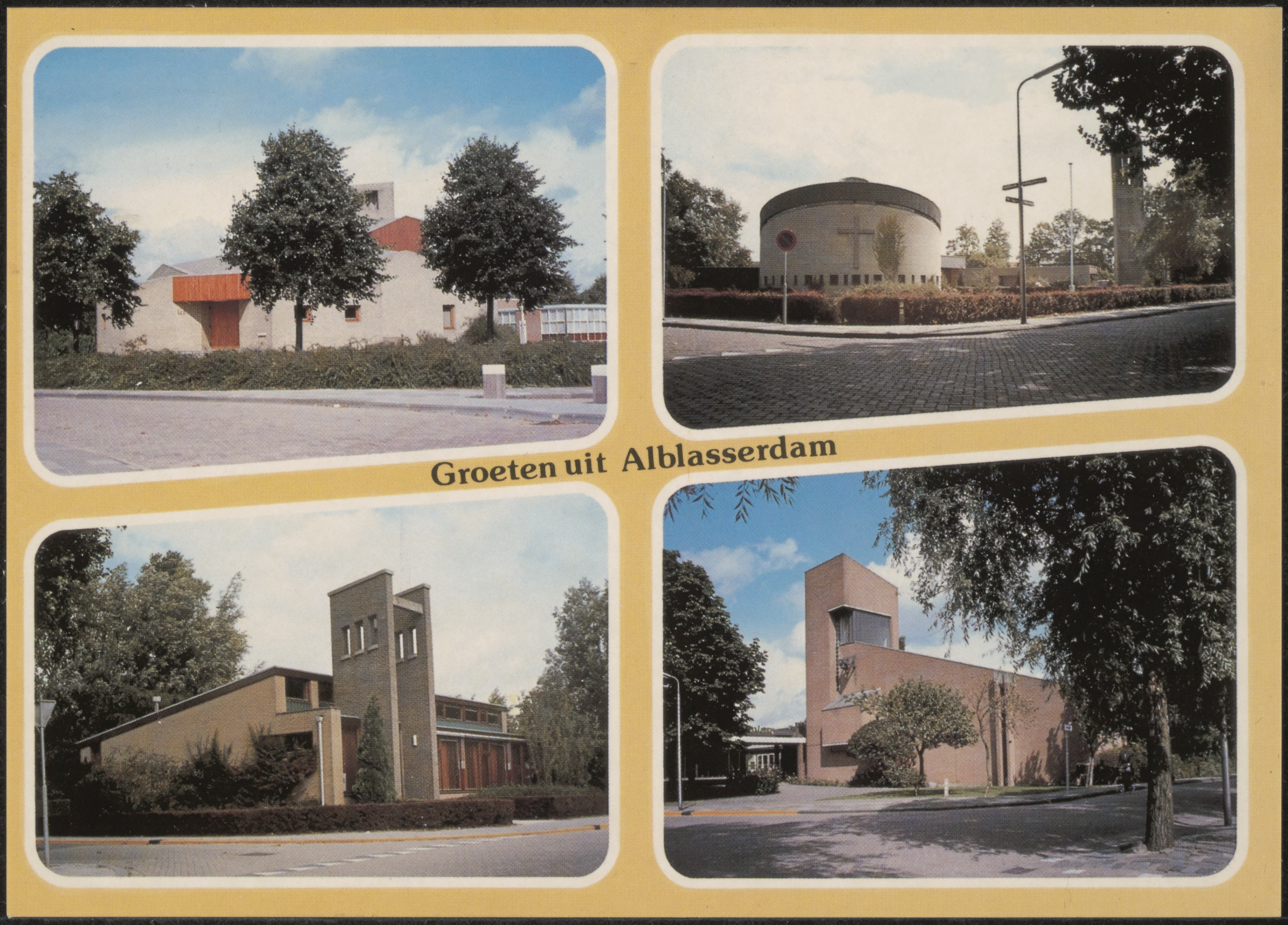 Alblasserdam. Linksboven: de Ichtuskerk aan het Scheldeplein. Rechtsboven: Fatimakerk …