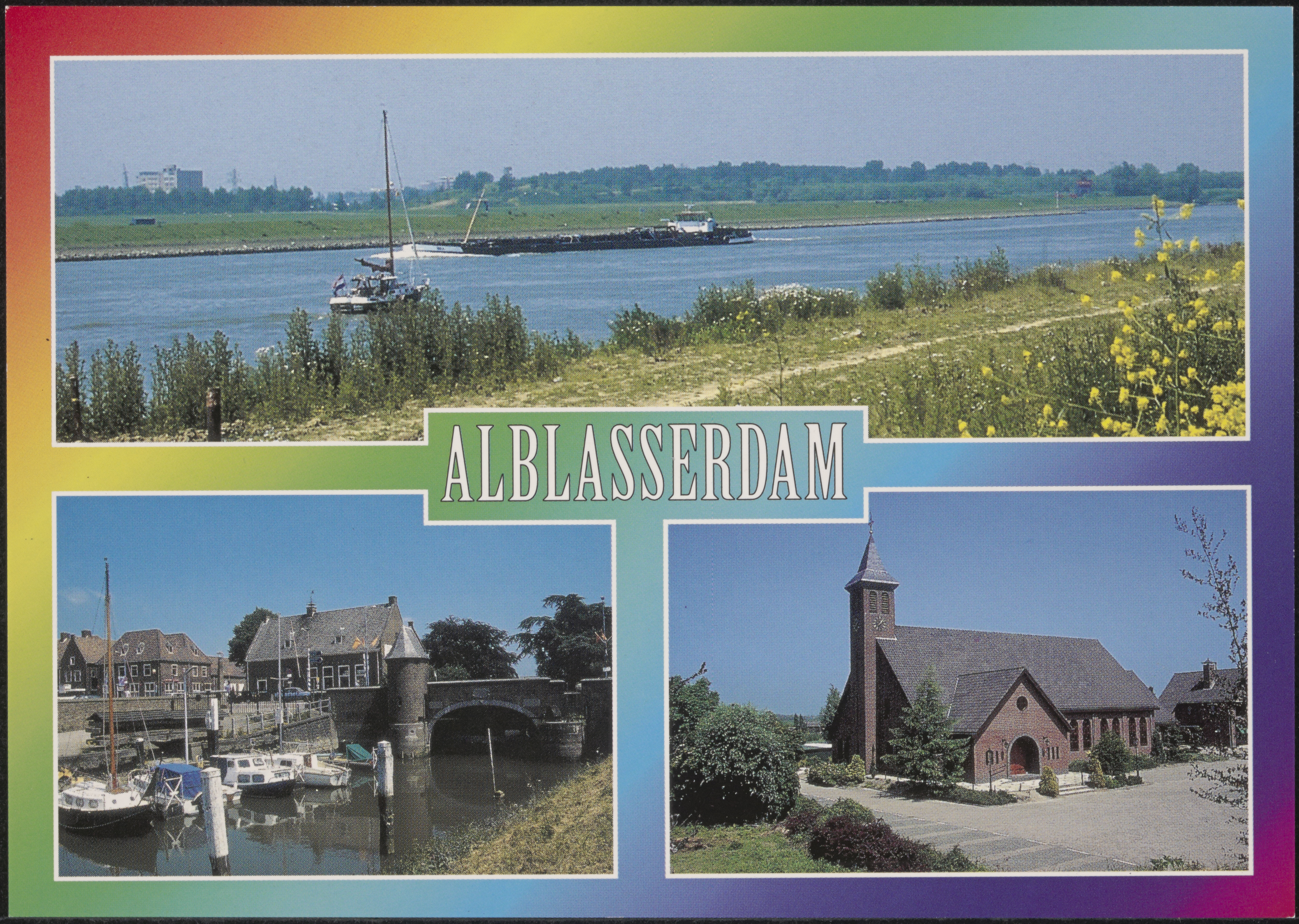 - Alblasserdam. Boven: Vanaf de Oost Kinderdijk zicht op de Noord en Ridderkerk. Linksonder: De sluis en het Waardhuis van de Nederwaard op de Dam, gezien vanaf het Zuiderstek. Rechtsonder. Gereformeerde Kerk aan het Ds.Toesplein.