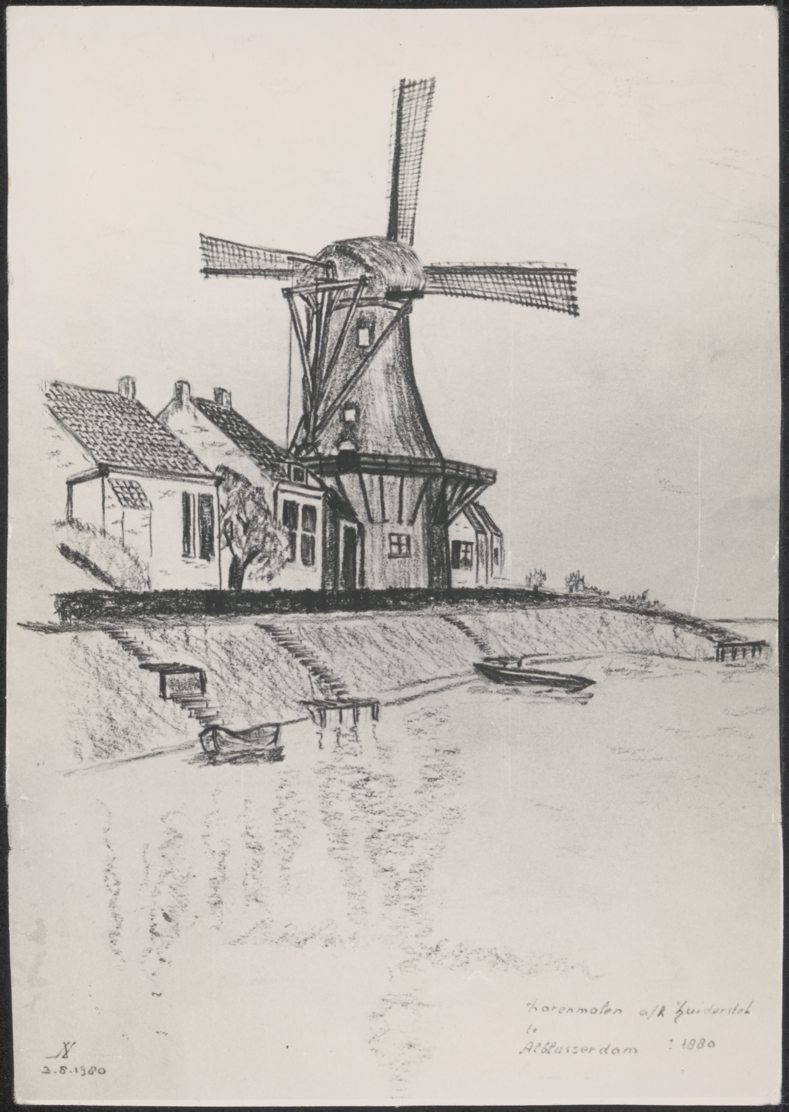 - Tekening van de korenmolen De Hoop aan het Zuiderstek in Alblasserdam.