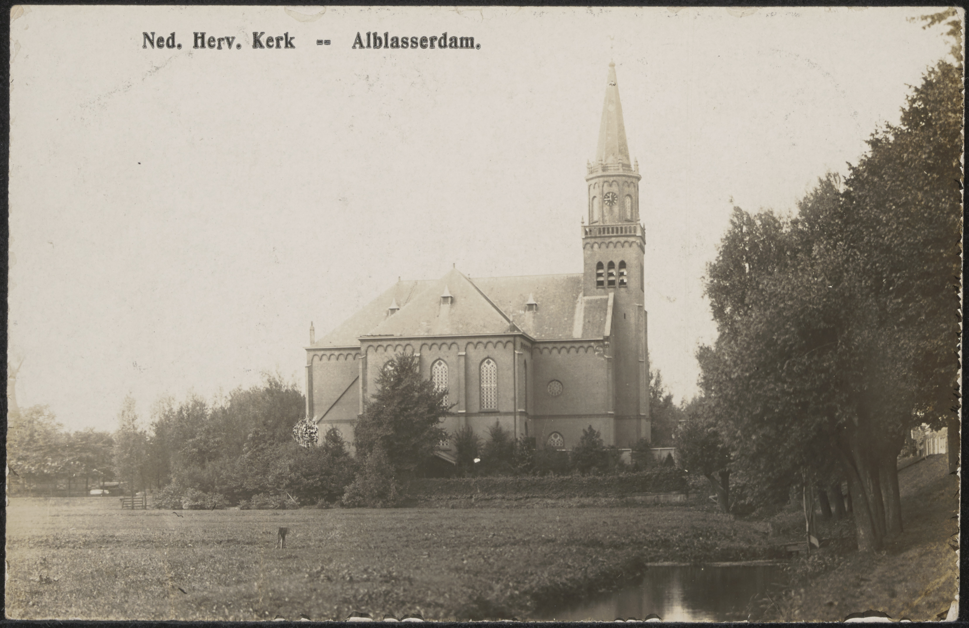 - Grote kerk aan het Cortgene gezien vanaf de Havenstraat in Alblasserdam.