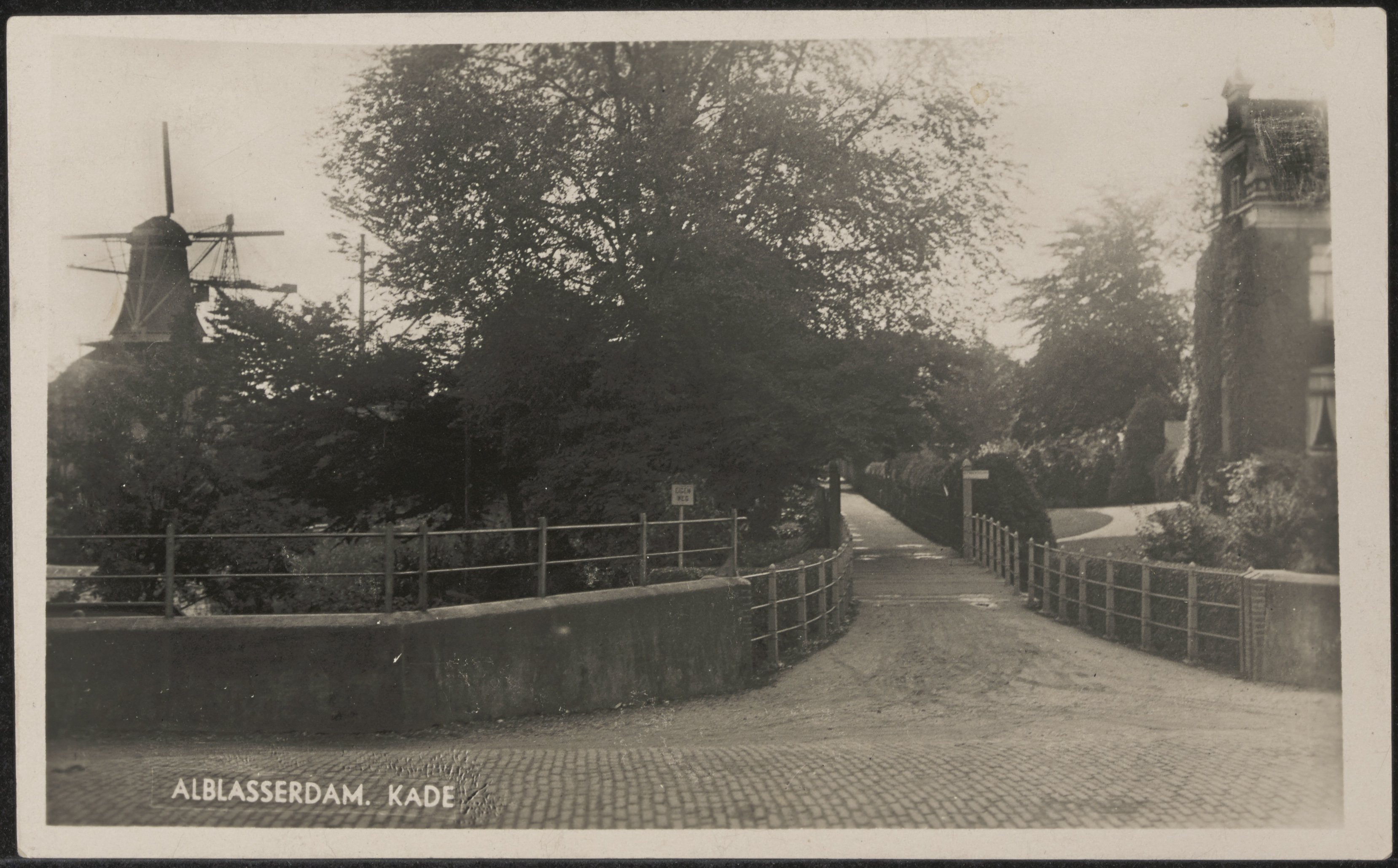 - Ingang van de Oude Werf langs de villa van Hendrik Smit aan de Eerste Kade in Alblasserdam. Links molen Ons Genoegen.