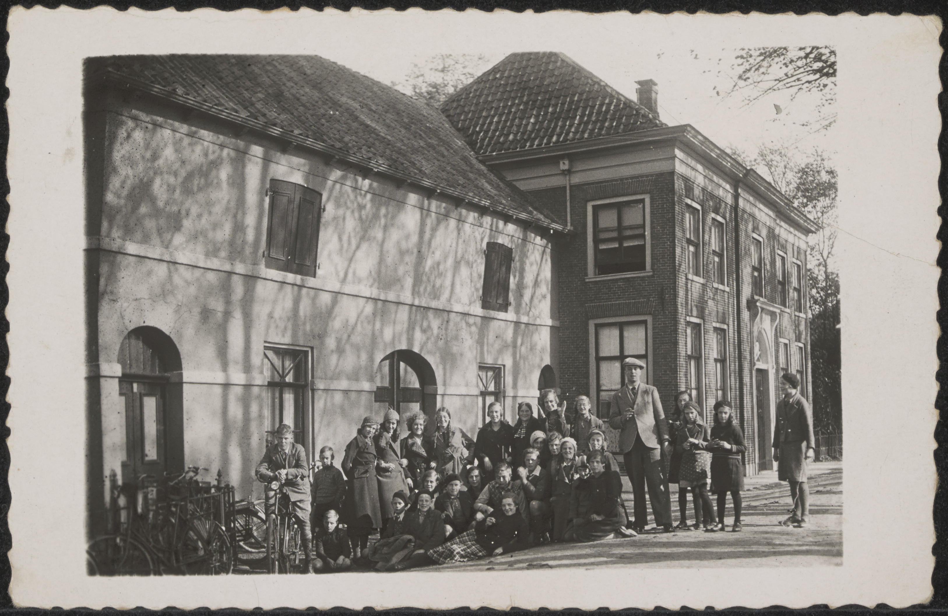 Groep scholieren voor het koetshuis van het voormalig ambachtsherenhuis van Cornelis …