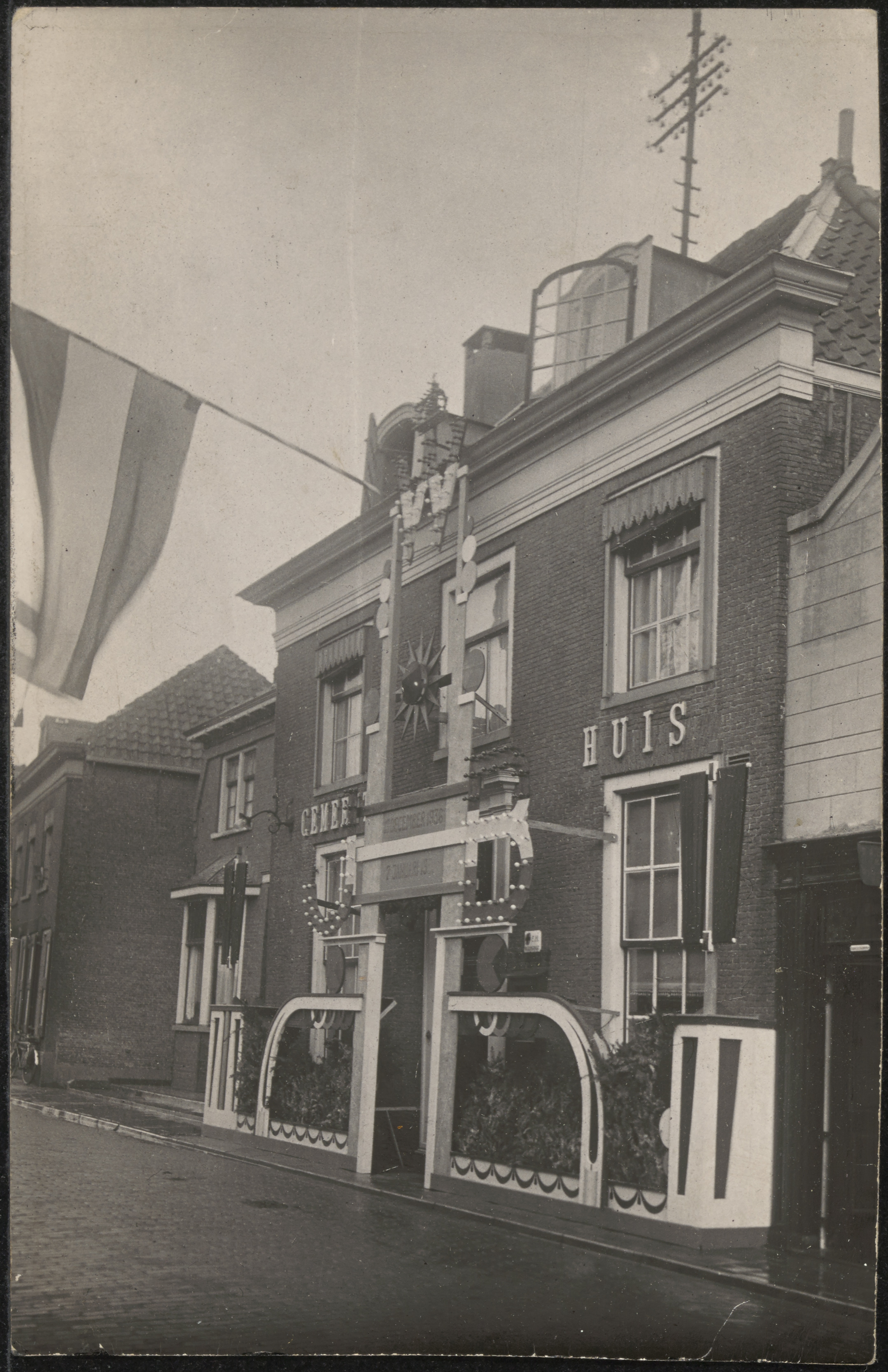 - Het versierde gemeentehuis op de Dam in Alblasserdam t.g.v. het huwelijk van Prinses Juliana en Prins Bernhard.