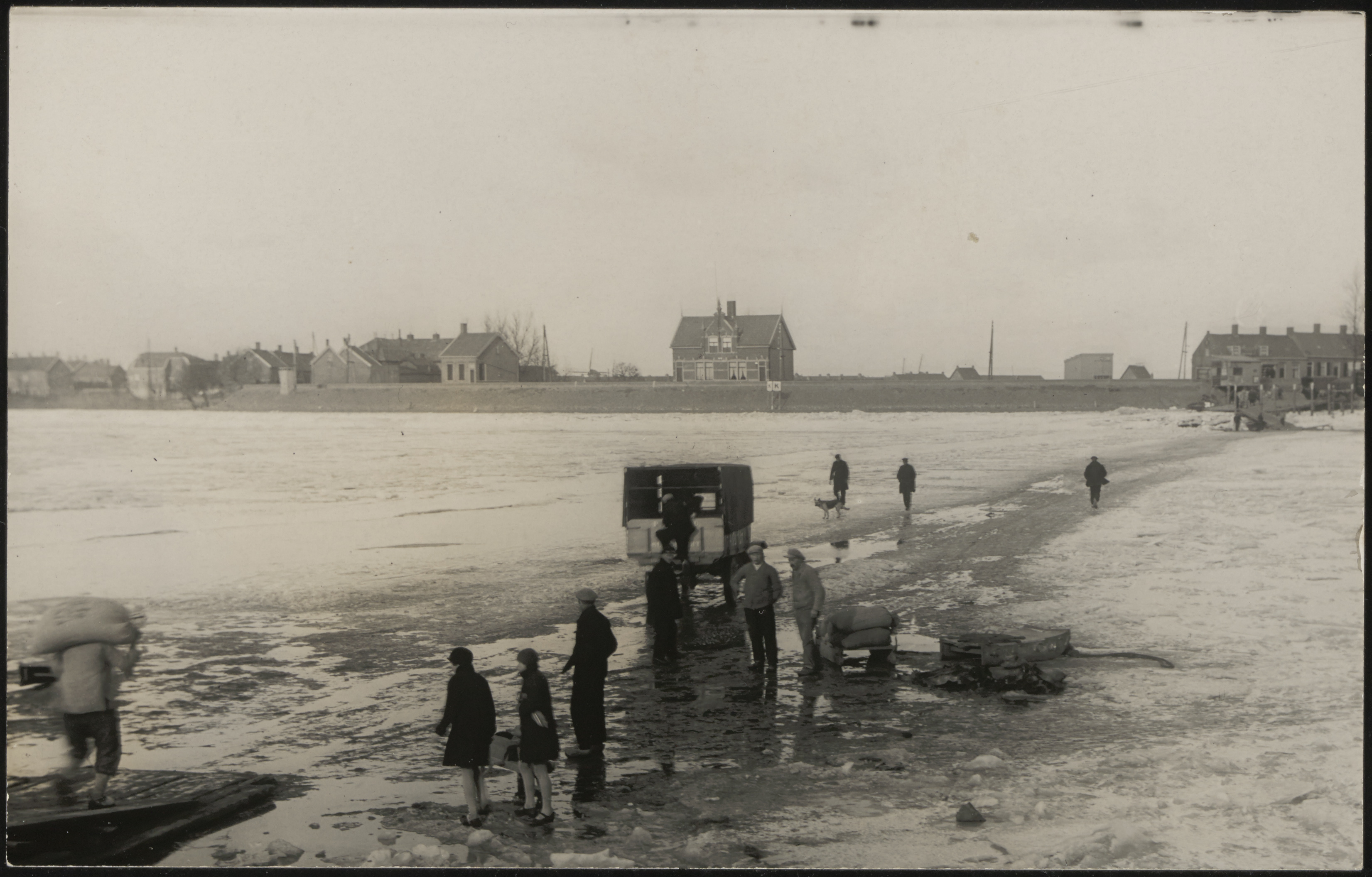 Vanaf Ridderkerk over de bevroren Noord in 1929 zicht op Oost en West Kinderdijk met het Rijzenwiel achter het huis in het midden (West Kinderdijk 23 van Fam.van Driel.) (bron HvWA).