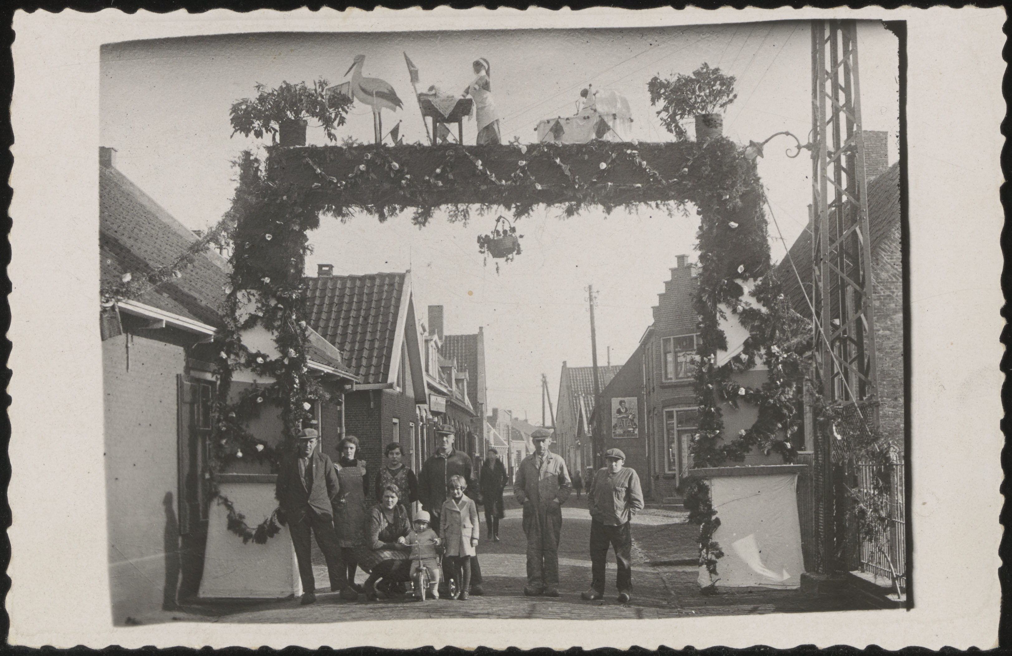 Erepoort in afwachting van geboorte Koningskind in de Polderstraat in Alblasserdam. Tevens buurtfeest in 1938