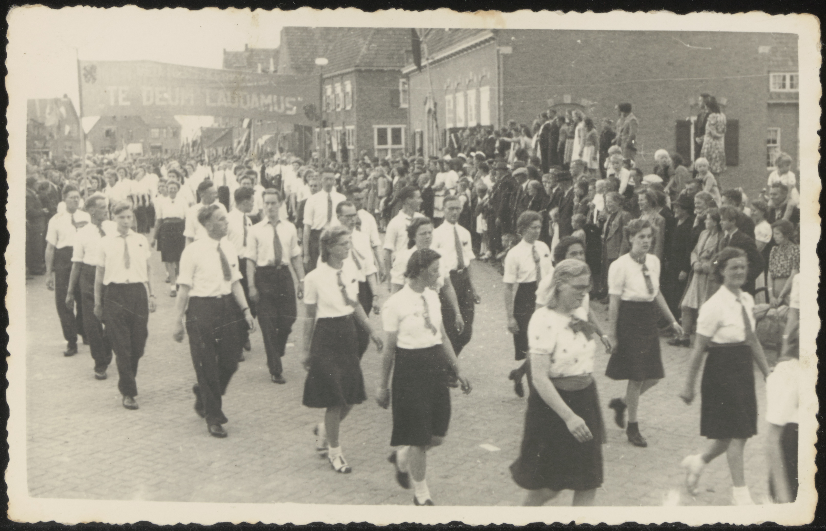 - In een optocht passeert het hervormde kerkkoor Te Deum Laudamus het waardhuis van de Nederwaard op de Dam in Alblasserdam.