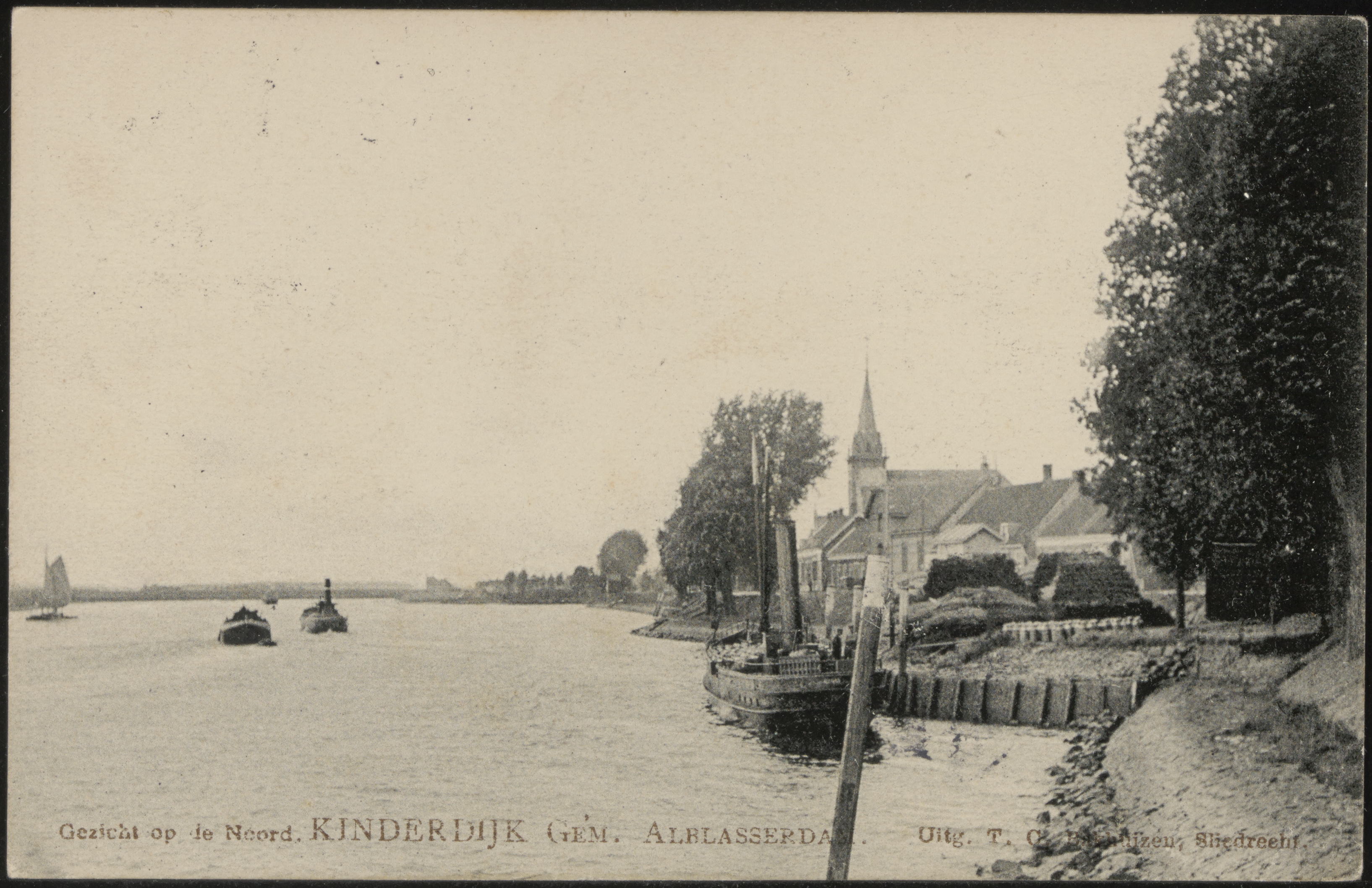 De Noord met rechts het Zg. Melkhoofdje aan de oost Kinderdijk , hiervandaan ging het transport van melk en rijshout.en de Gereformeerde kerk op de achtergrond. (bron HvWA).